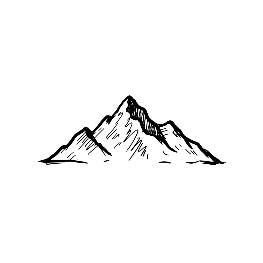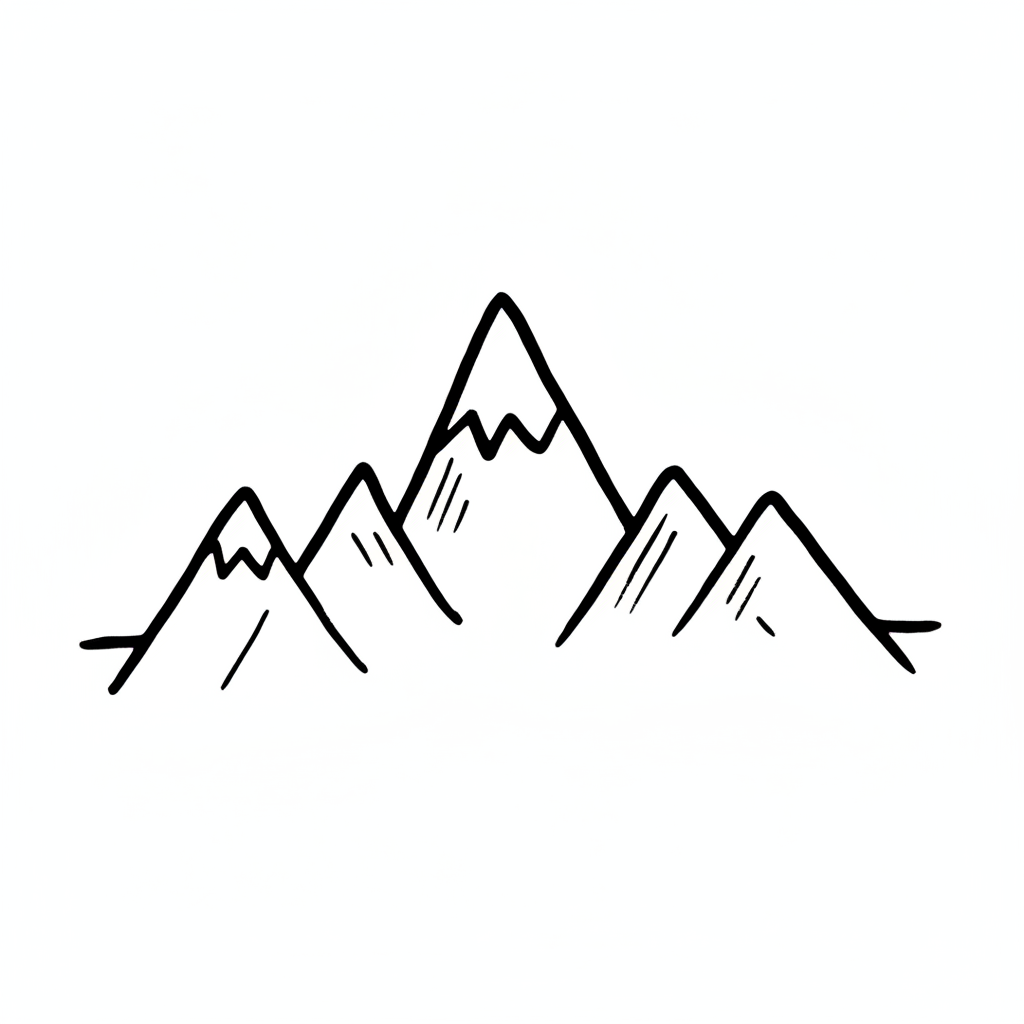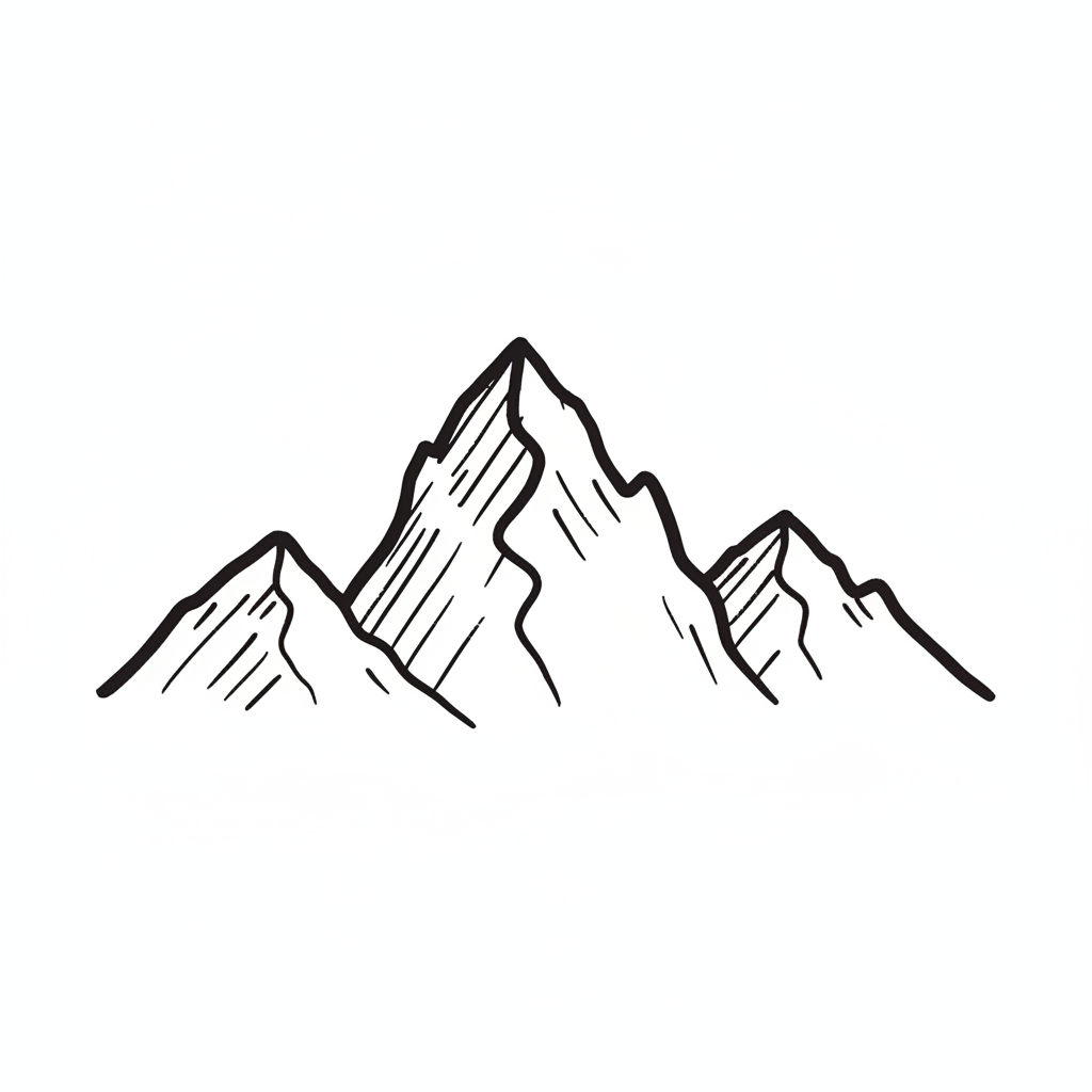 Stilisierte Schwarz-Weiß-Zeichnung einer Bergkette mit drei Gipfeln im Handgezeichneten Stil.