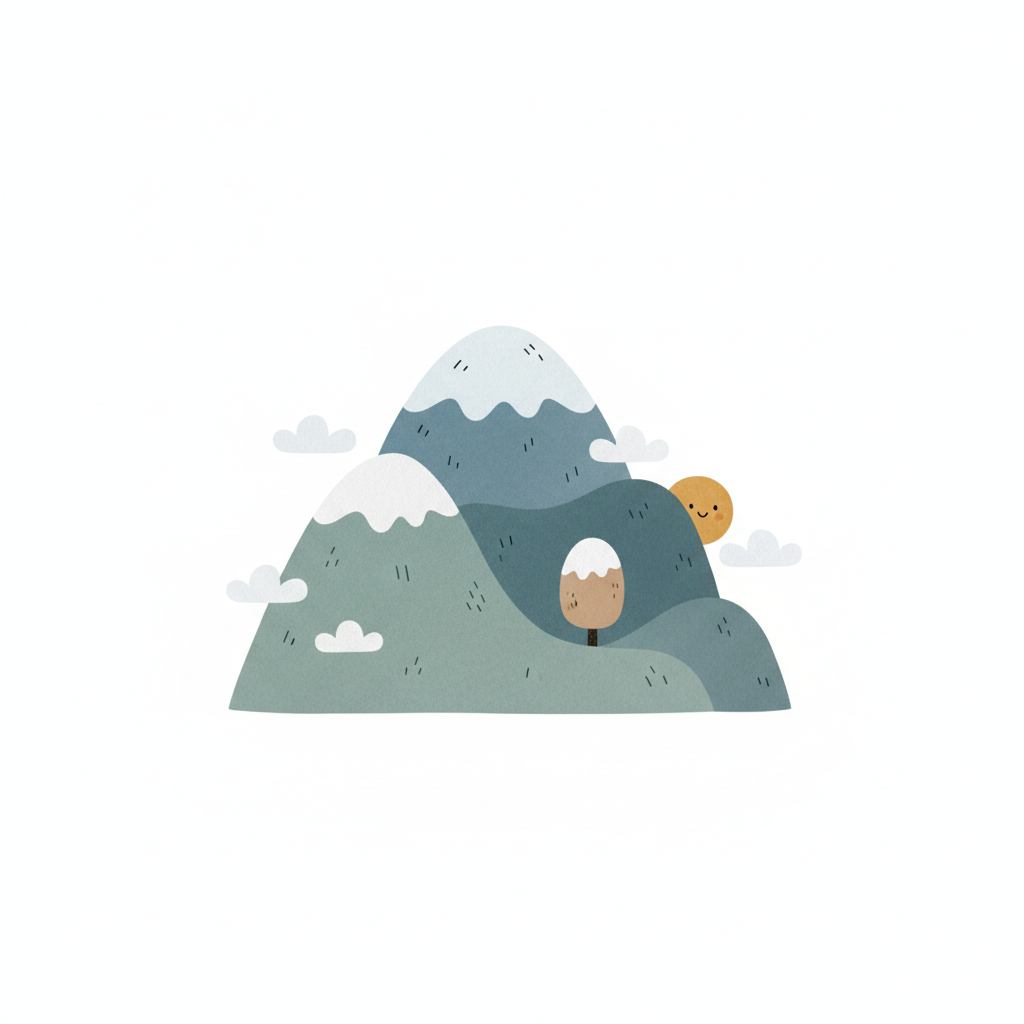 Niedliche, stilisierte Berglandschaft mit pastellfarbenen Gipfeln, Schneekappen und einfachen Bäumen.