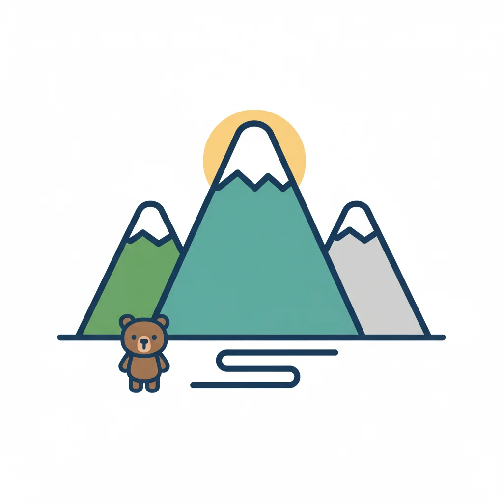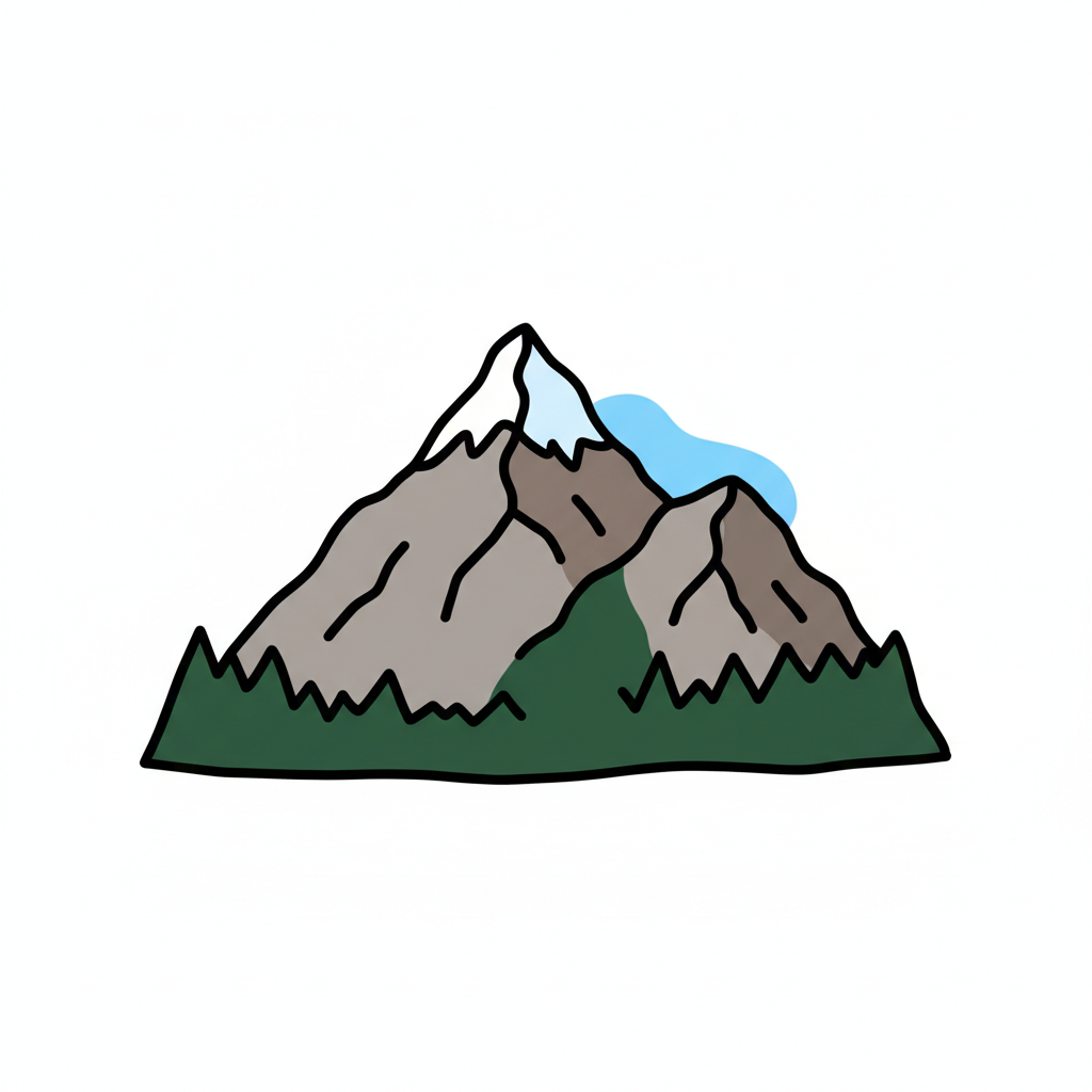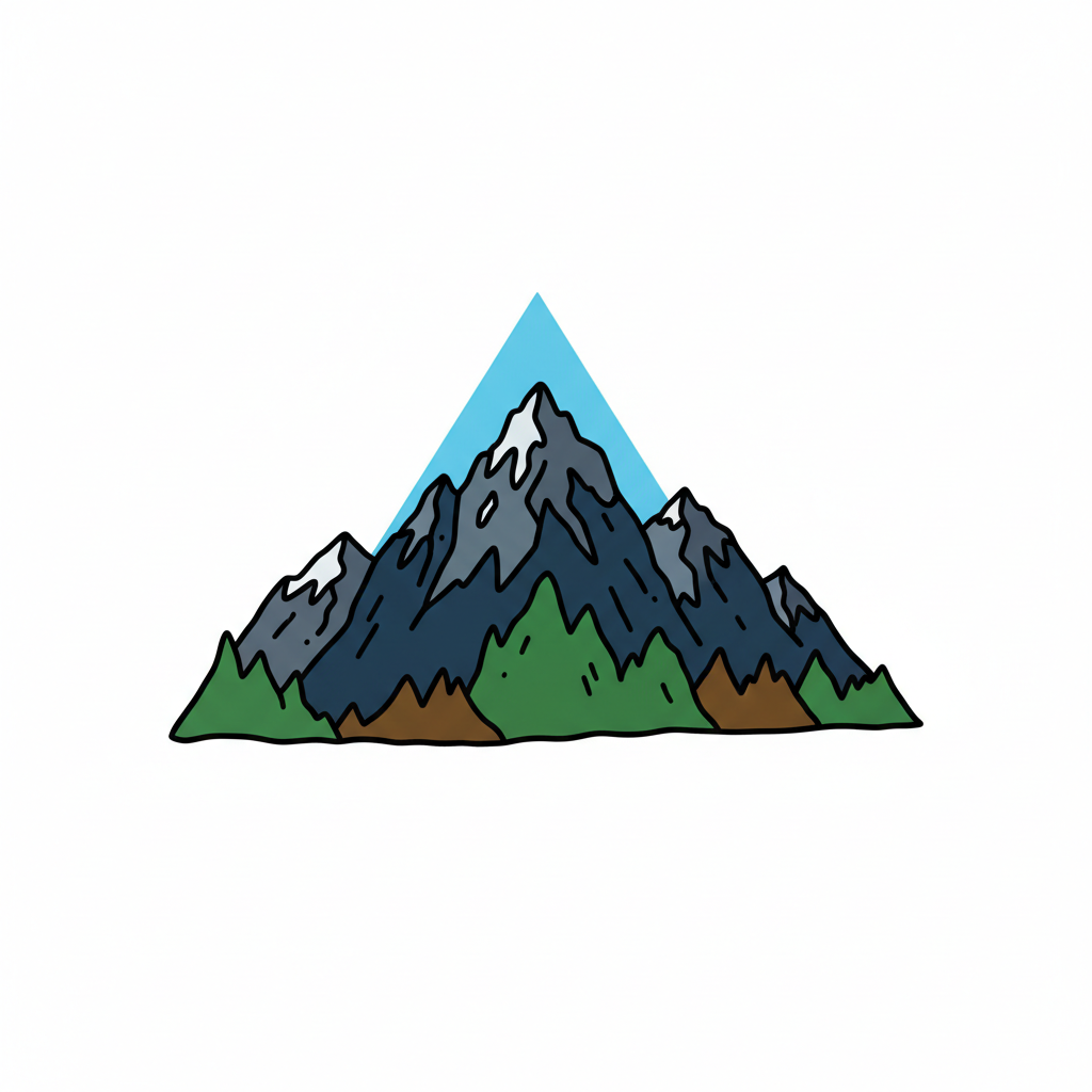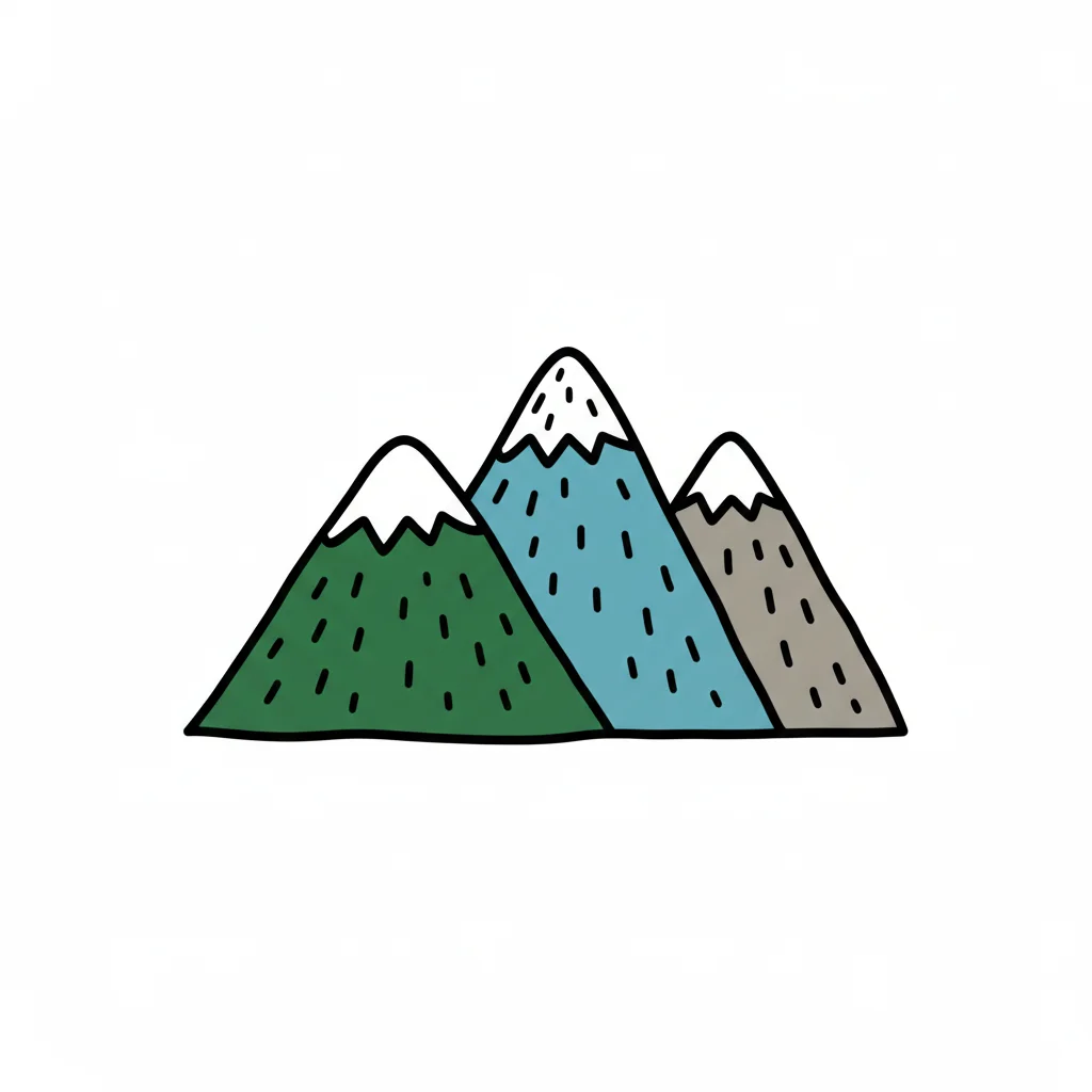 Drei bunte, handgezeichnete Berge mit schneebedeckten Gipfeln auf weißem Hintergrund.