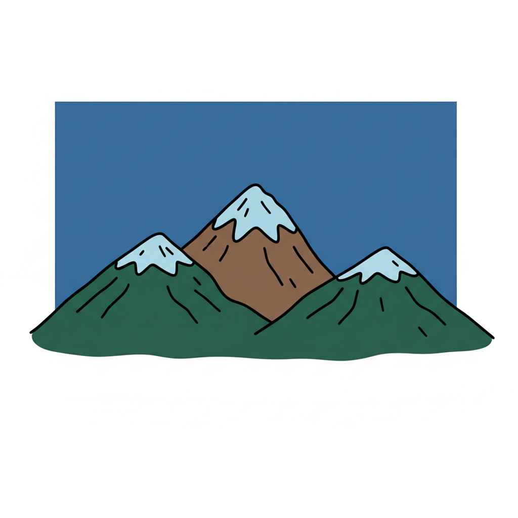 Stilisierte Zeichnung einer Bergkette mit schneebedeckten Gipfeln, grünen Bäumen und blauem Hintergrund.