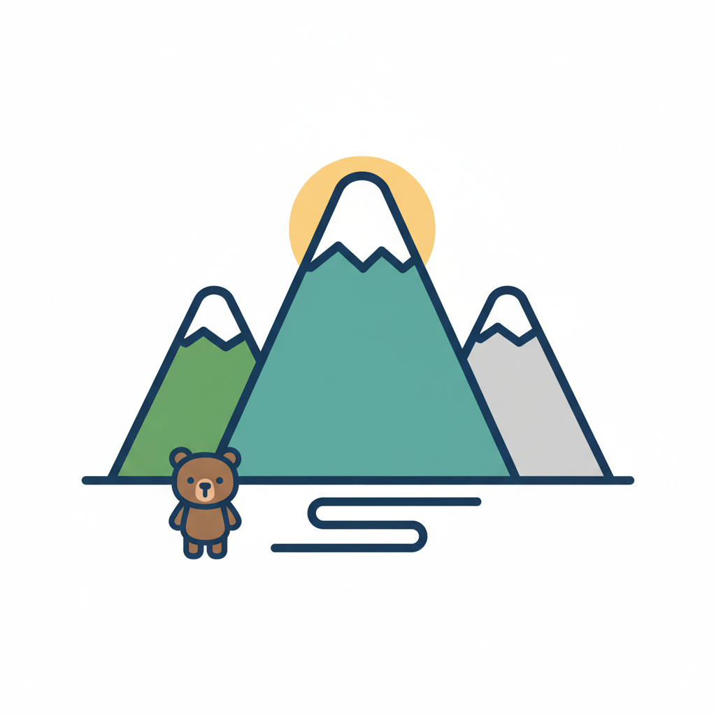 Süßer Cartoon-Bär vor drei Bergen mit schneebedeckten Gipfeln und aufgehender Sonne.