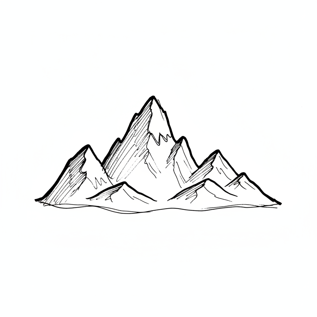 Handgezeichnete Skizze einer Bergkette mit mehreren Gipfeln in Schwarz-Weiß.