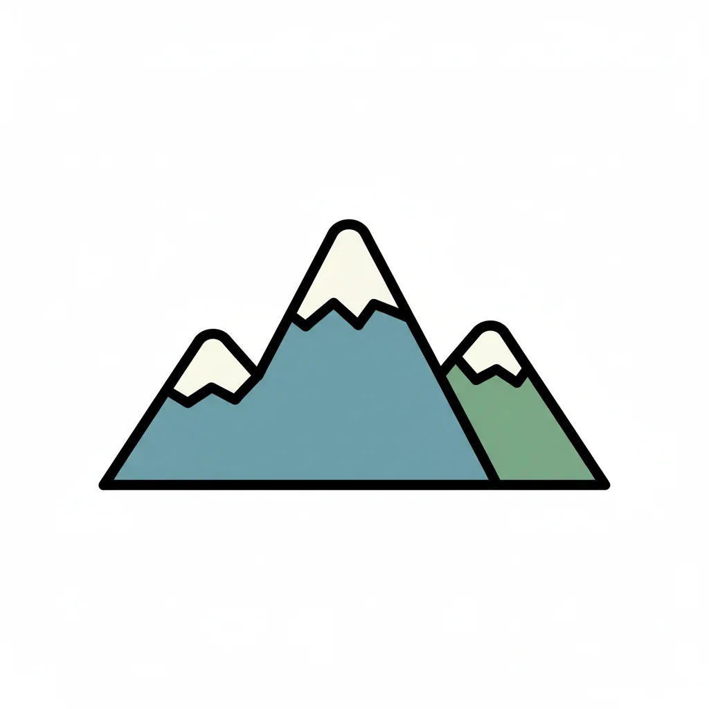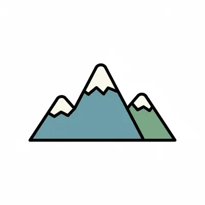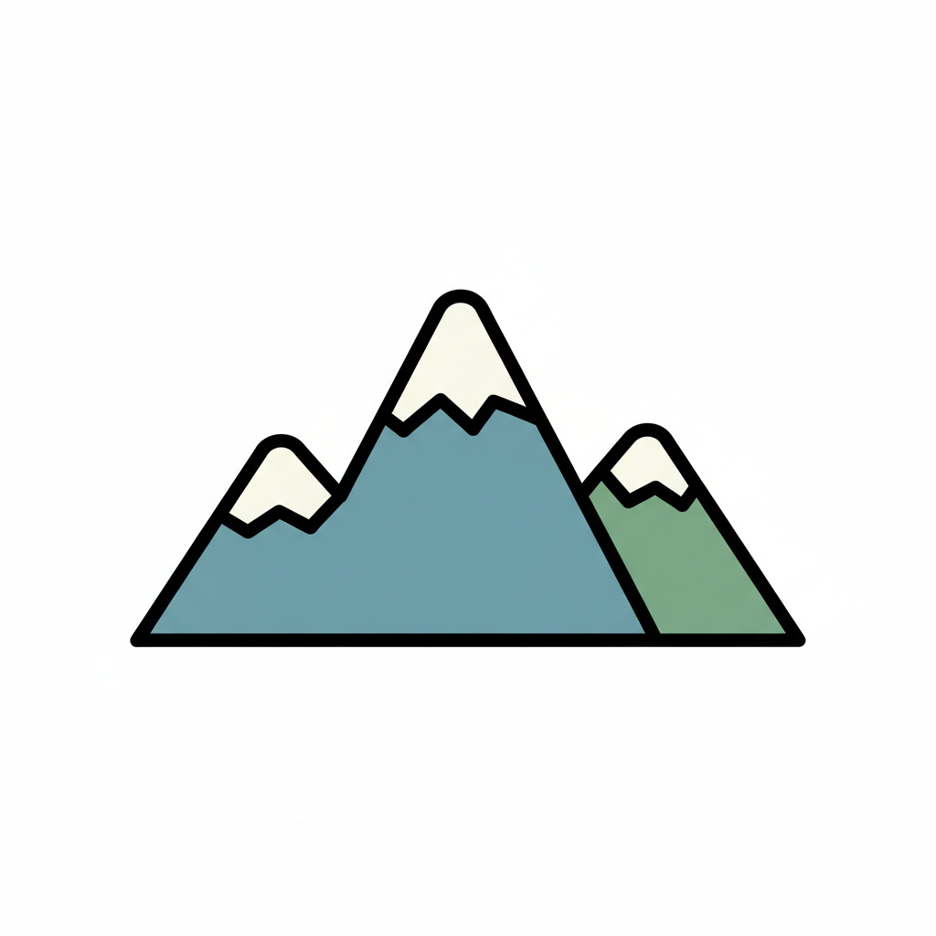 Stilisierte Illustration von drei Bergen mit schneebedeckten Gipfeln in Blau und Grün.