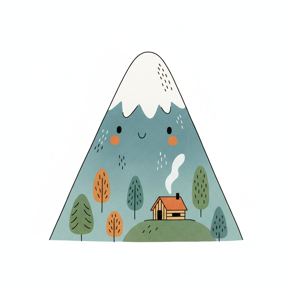 Niedlicher Cartoon-Berg mit lächelndem Gesicht, Schnee, Bäumen und einer rauchenden Hütte.