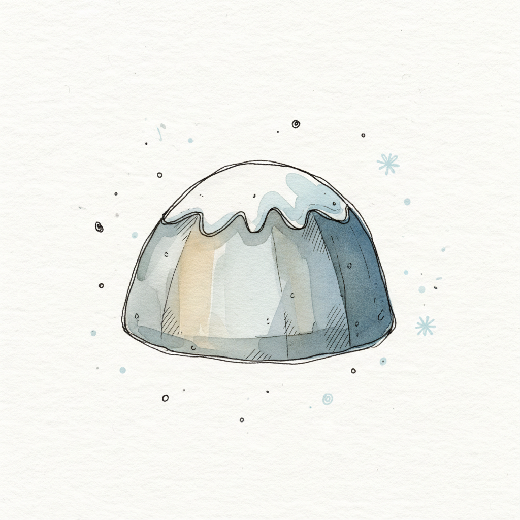 Stilisierter, schneebedeckter Berg in Aquarellfarben, umgeben von kleinen Schneeflocken.