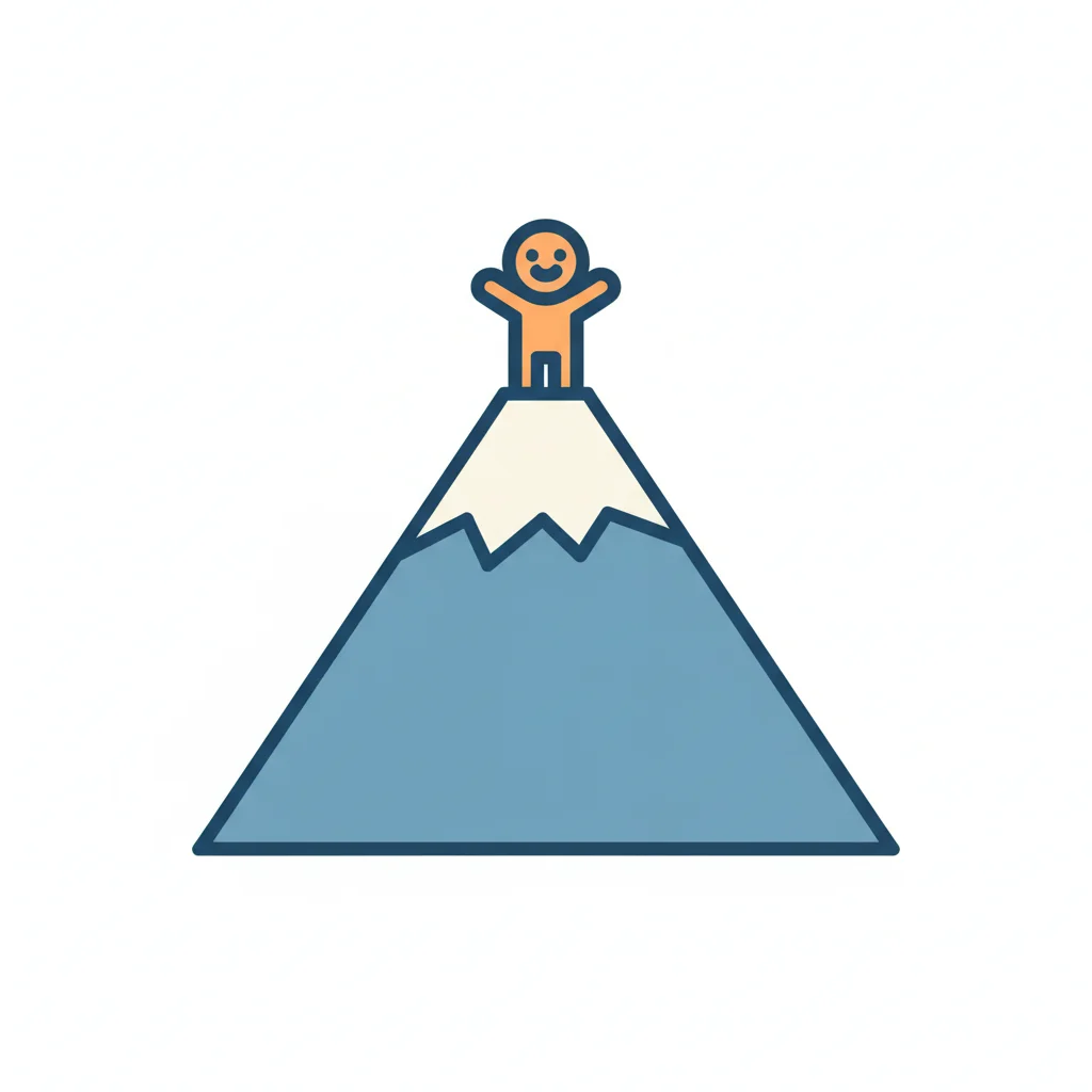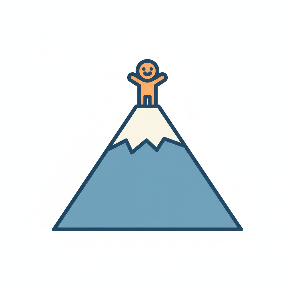 Ein lächelndes Strichmännchen erklimmt einen Berg, die Sonne scheint am Gipfel.