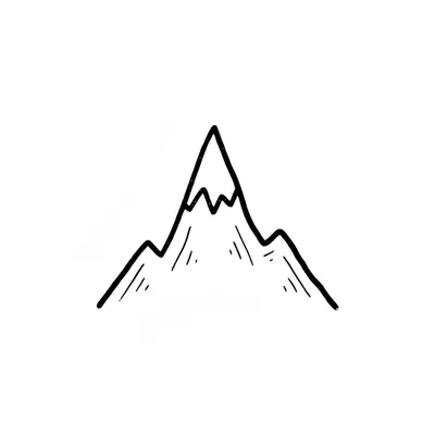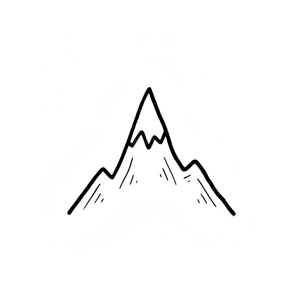 Minimalistische Schwarz-Weiß-Zeichnung einer Bergkette mit einem schneebedeckten Gipfel.