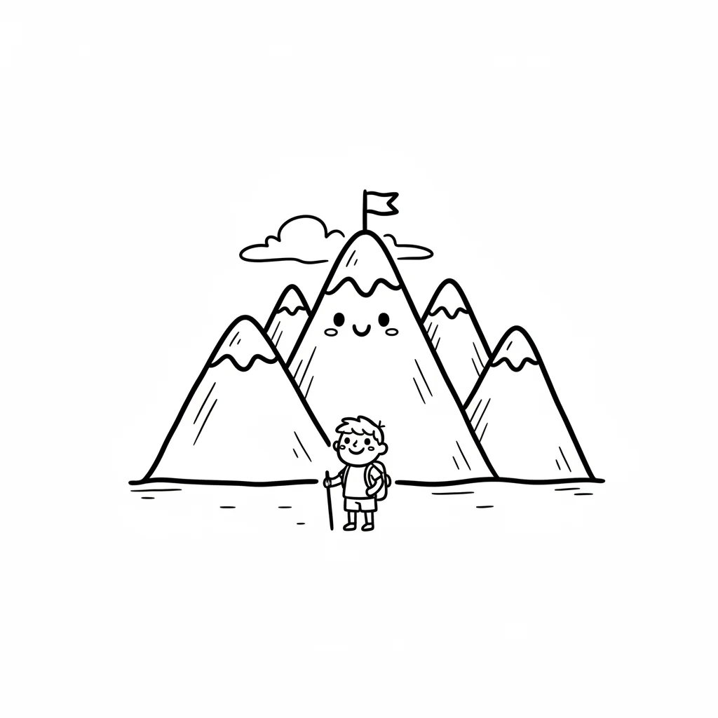 Niedlicher Cartoon: Ein Wanderer steht vor einem lächelnden Berg mit Flagge auf dem Gipfel.