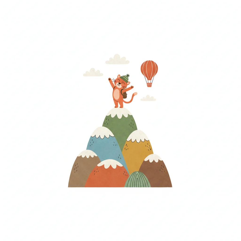 Fröhliche Cartoon-Katze feiert auf einem Berggipfel, umgeben von bunten Bergen und einem Heißluftballon.