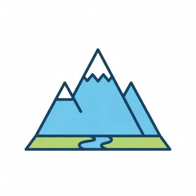 Stilisierte Berge mit schneebedeckten Gipfeln, grünem Land und einem Fluss in flachem Design.
