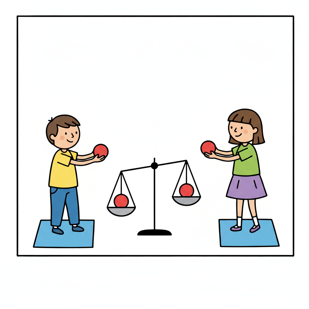 Ein Junge und ein Mädchen halten Bälle, während eine Waage mit Bällen im Gleichgewicht ist.