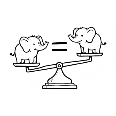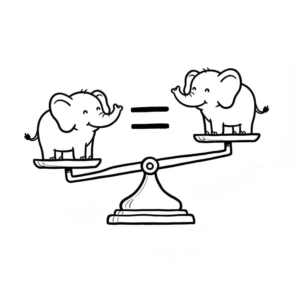 Zwei identische Cartoon-Elefanten auf einer perfekt ausbalancierten Waage mit Gleichheitszeichen.