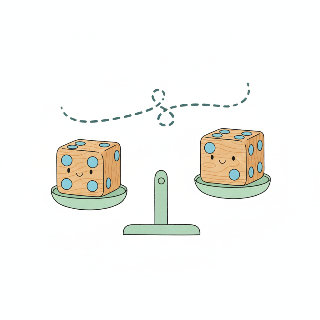 Zwei lächelnde Holzwürfel mit blauen Punkten balancieren perfekt auf einer grünen Waage.