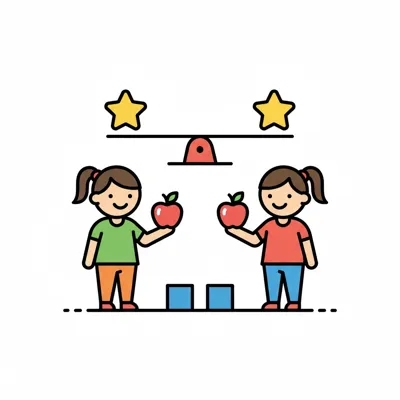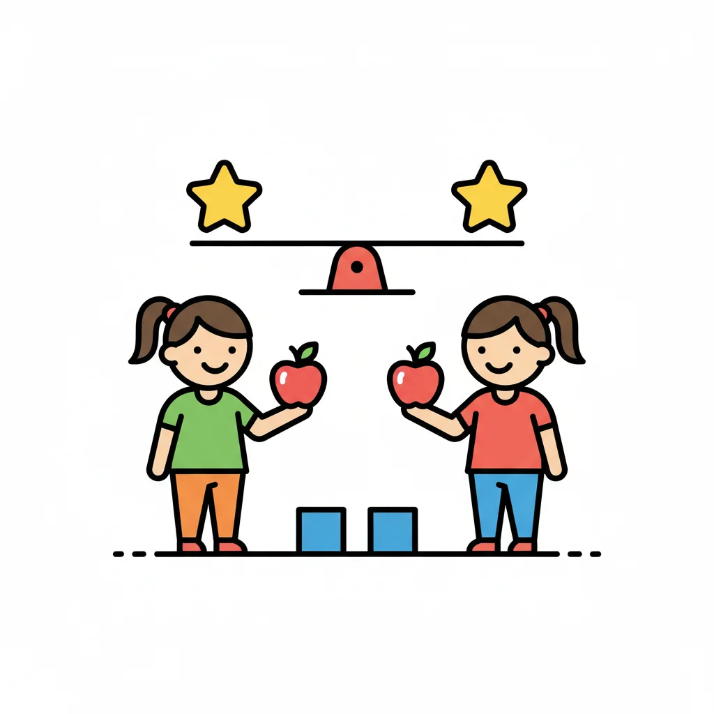 Zwei lächelnde Mädchen halten Äpfel, über ihnen eine balancierte Waage mit Sternen.