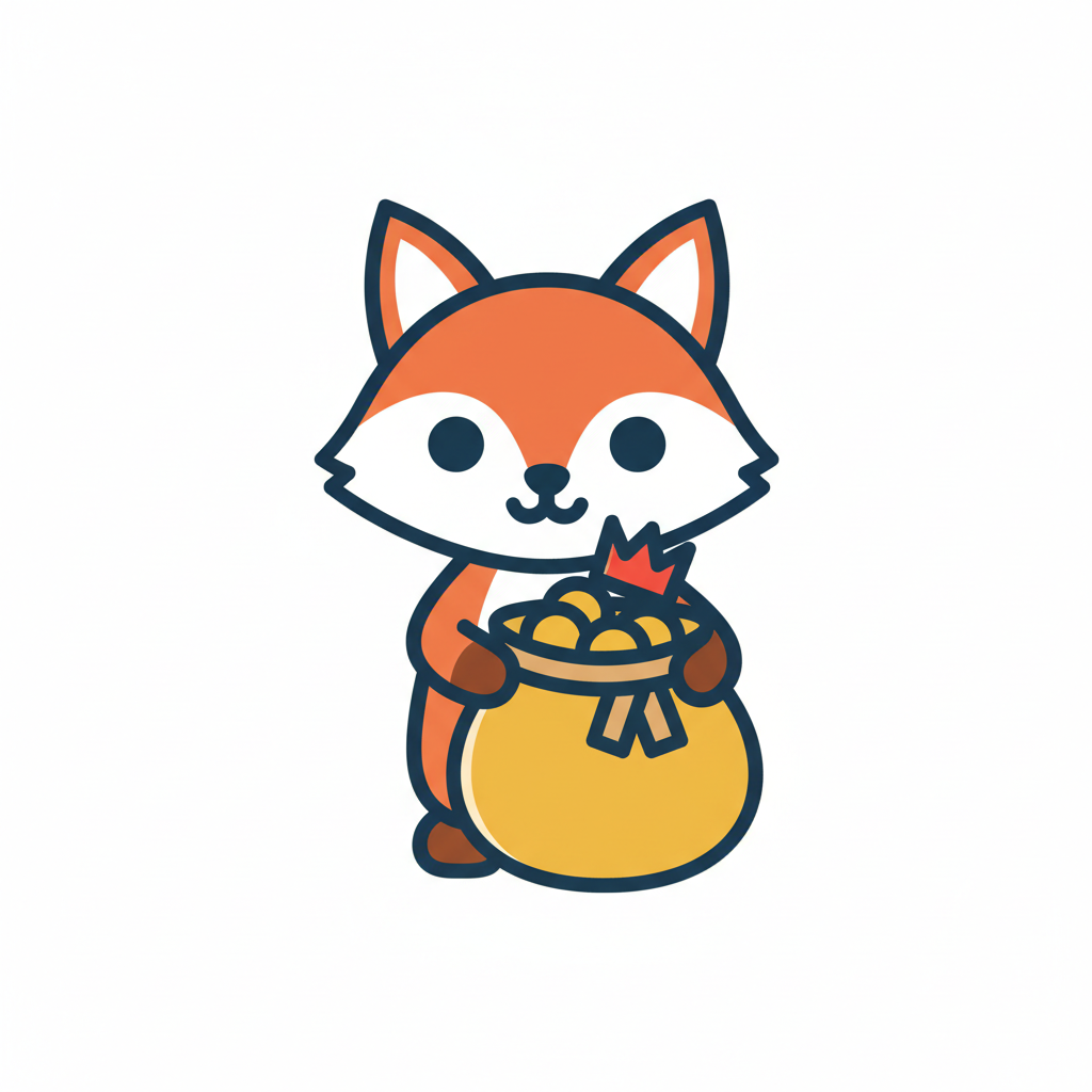 Niedlicher Cartoon-Fuchs hält einen Sack voller Goldmünzen mit einer kleinen Krone.