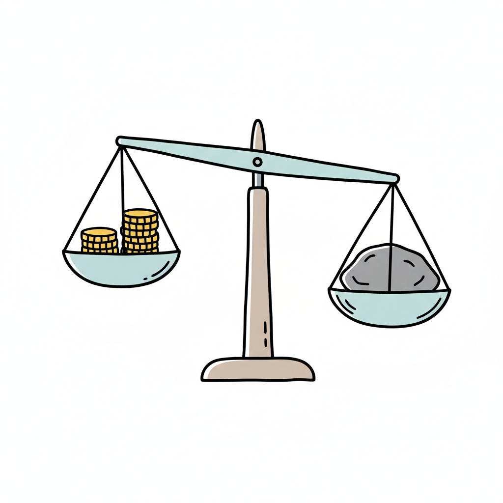 Eine Waage mit Goldmünzen auf der einen und einem Stein auf der anderen Seite, im Gleichgewicht.