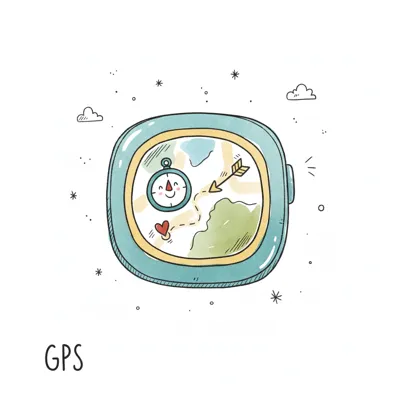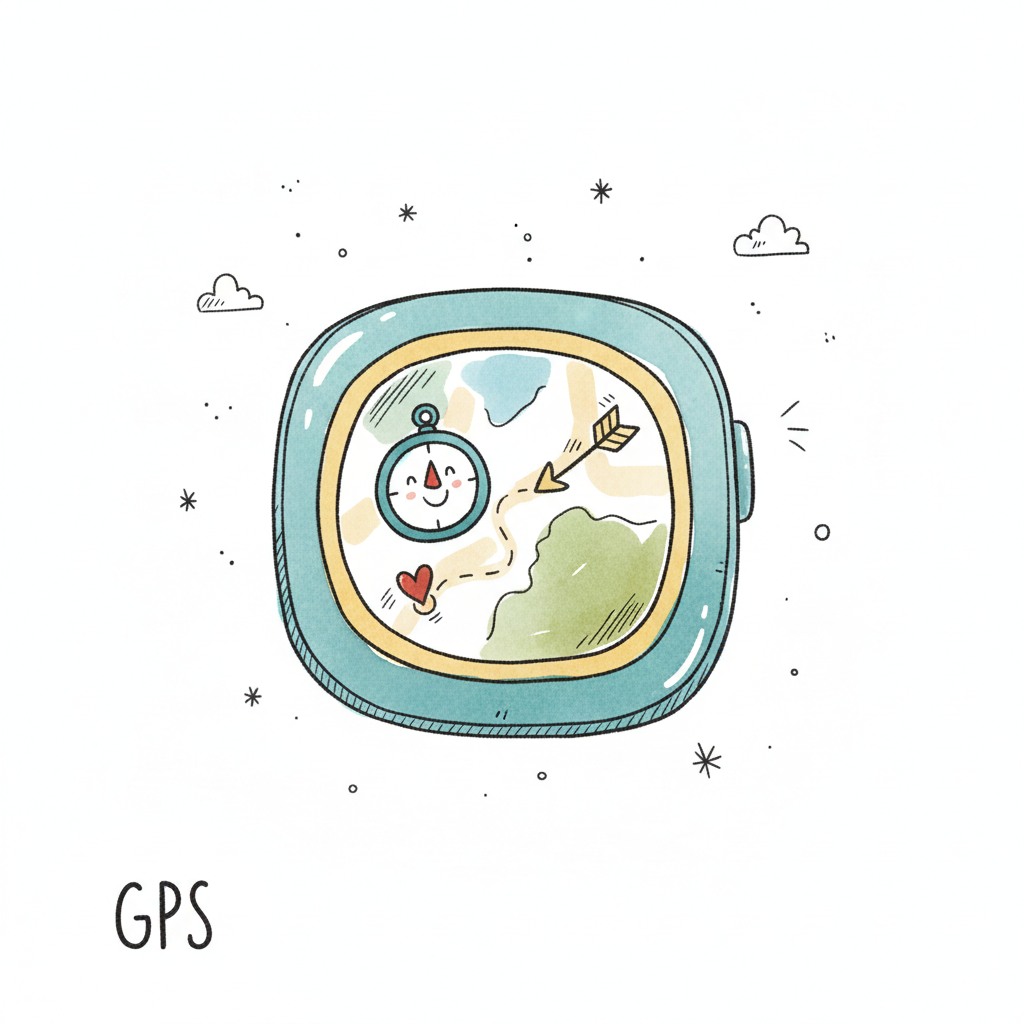 Niedliches GPS-Gerät mit lächelndem Kompass, Karte und Herzsymbol, das Navigation darstellt.