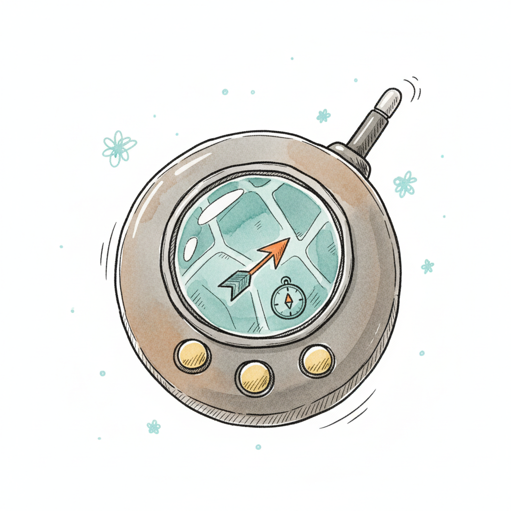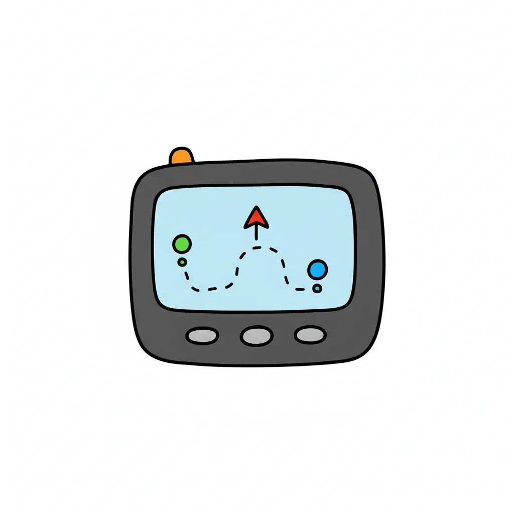 Illustration eines runden Navigationsgeräts mit Karte, Pfeil und Kompass auf dem Bildschirm.