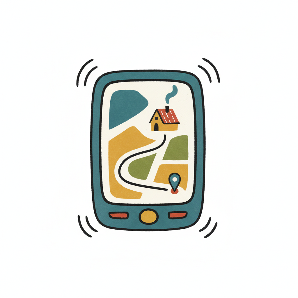 Smartphone mit einer Karte, die ein Haus und einen Weg zeigt, mit Standort-Pin und Signalwellen.