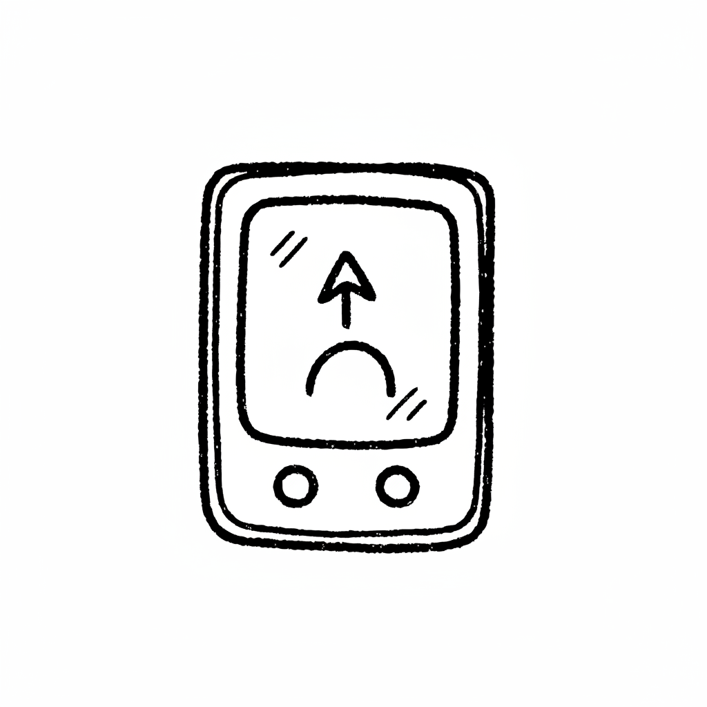 Skizze eines Navigationsgeräts mit Richtungspfeil und Kurvensymbol auf dem Display.