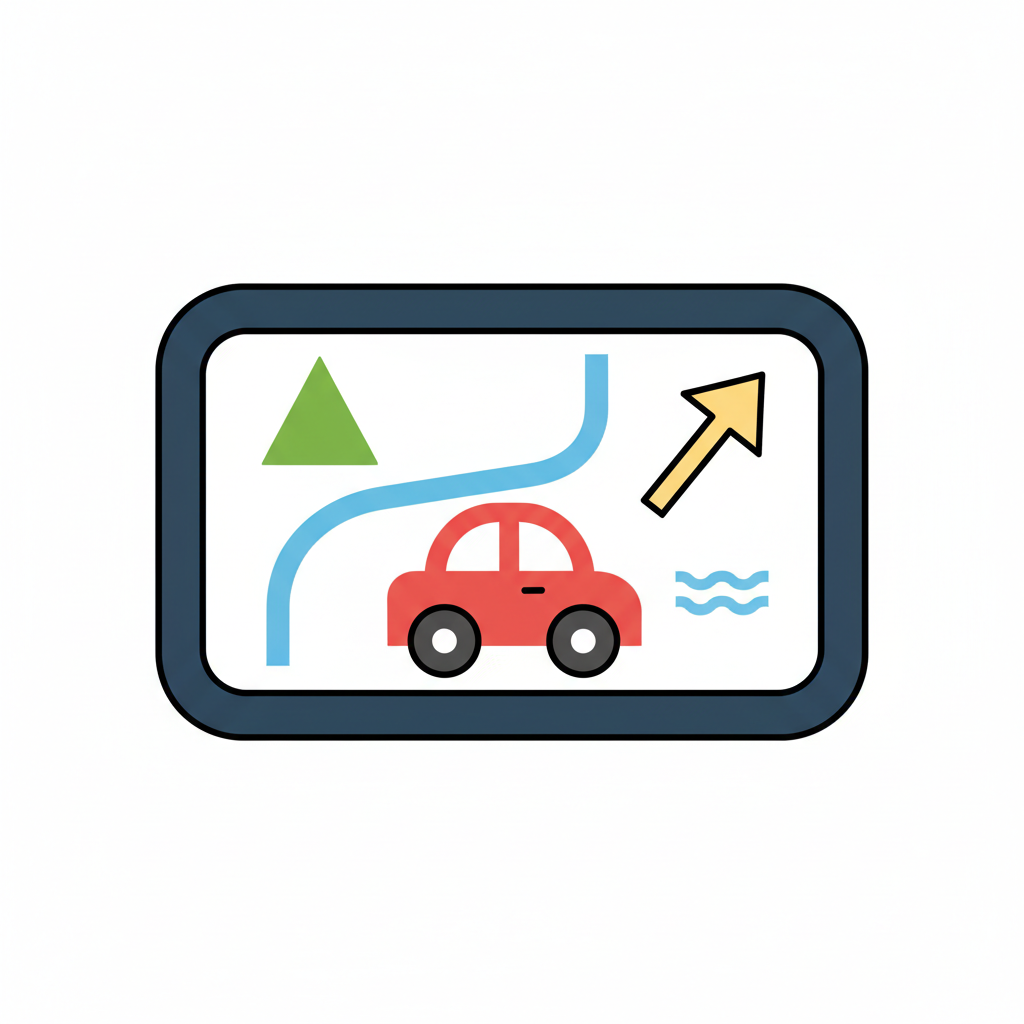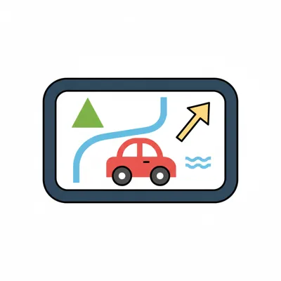 Icon: Rotes Auto auf Navigationsbildschirm mit Route, Berg und Wasser.