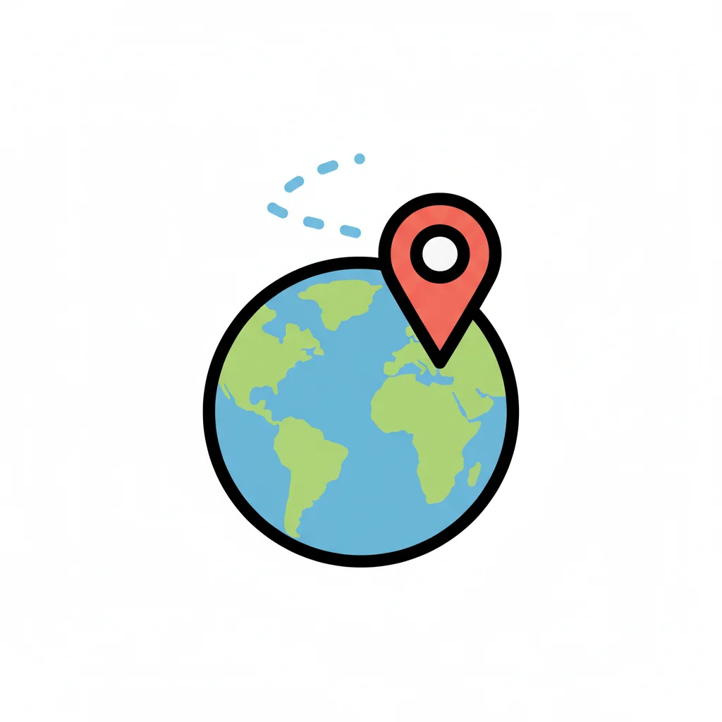 Globus-Icon mit rotem Standort-Pin und gestrichelter Linie, die Reise oder Ortung symbolisiert.