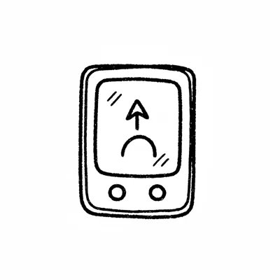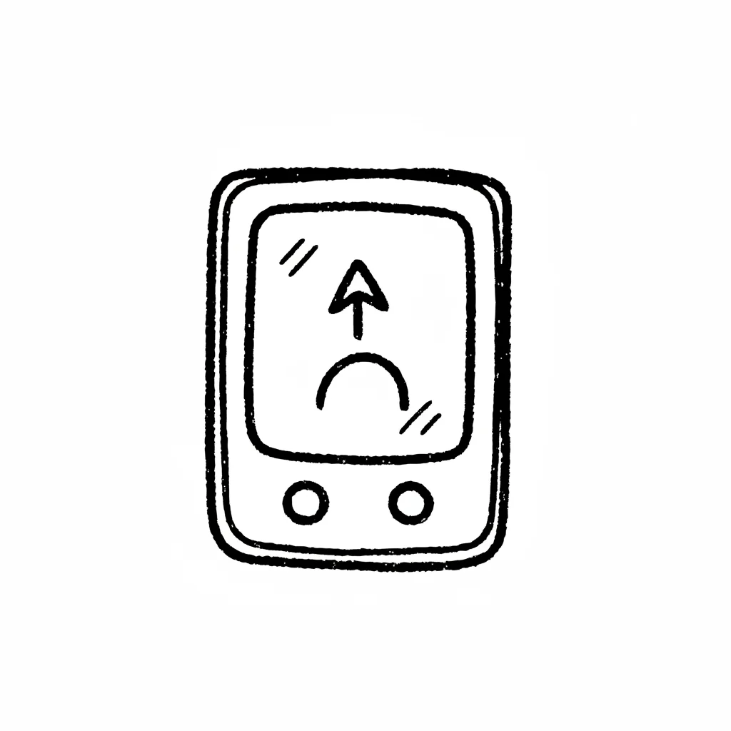 Handgezeichnetes Navigationsgerät mit Karte, Kompass und Zoom-Tasten auf weißem Hintergrund.