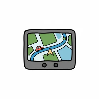 Ein gezeichnetes Navigationsgerät zeigt eine Karte mit einem roten Auto und Routenführung.
