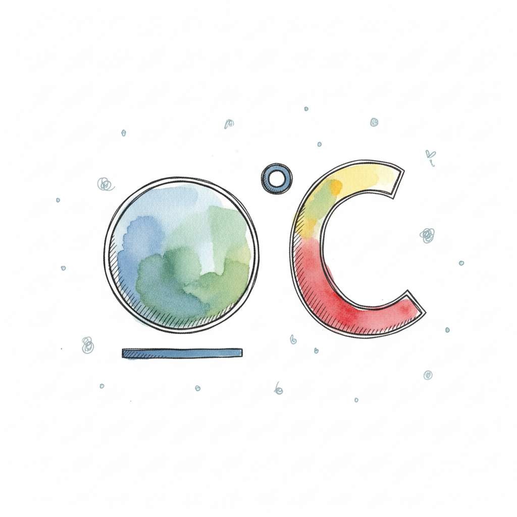 Aquarell-Darstellung von 0°C mit farbigen Buchstaben und handgezeichnetem Stil.