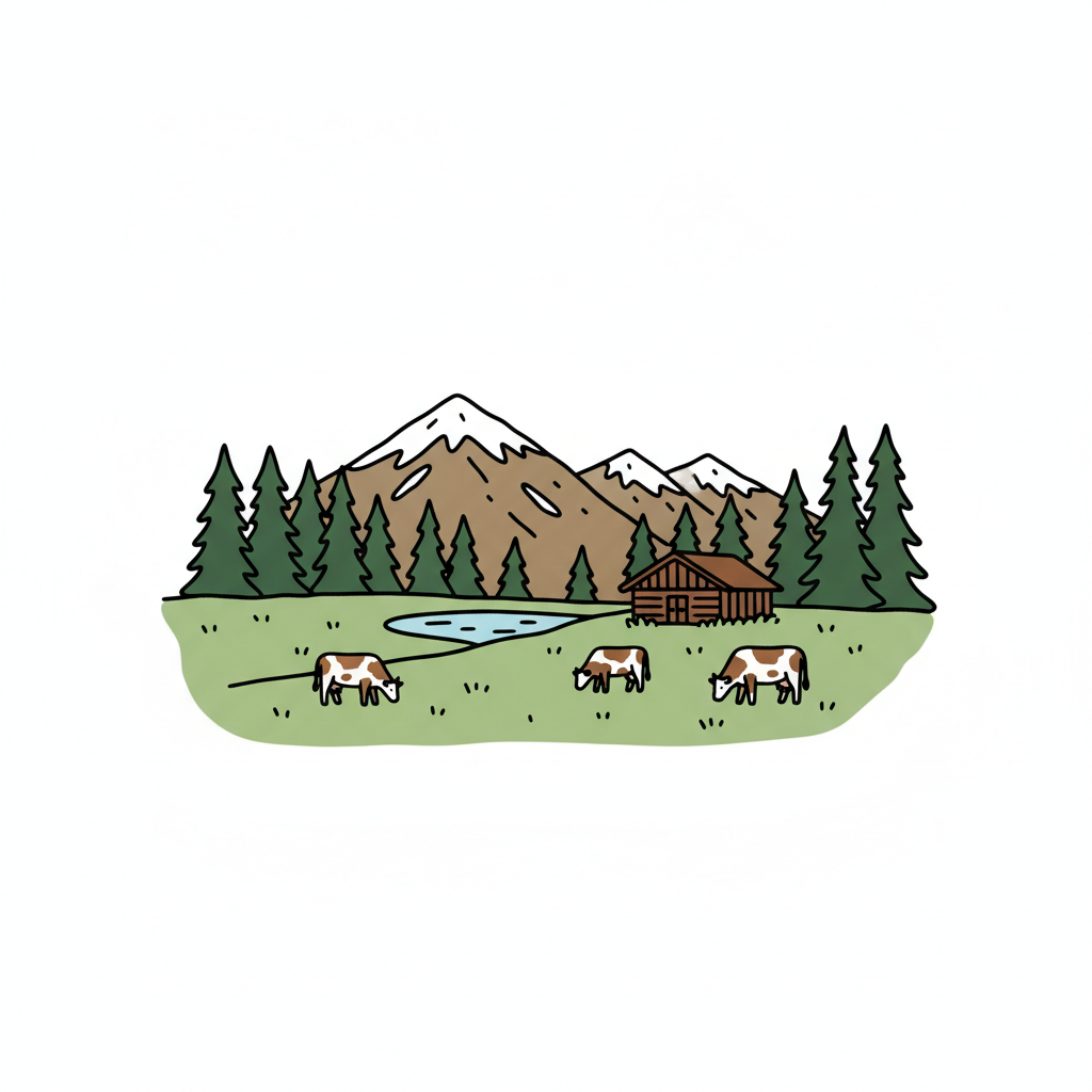 Idyllische Berglandschaft mit grasenden Kühen, Hütte, See und Tannenbäumen im Cartoon-Stil.