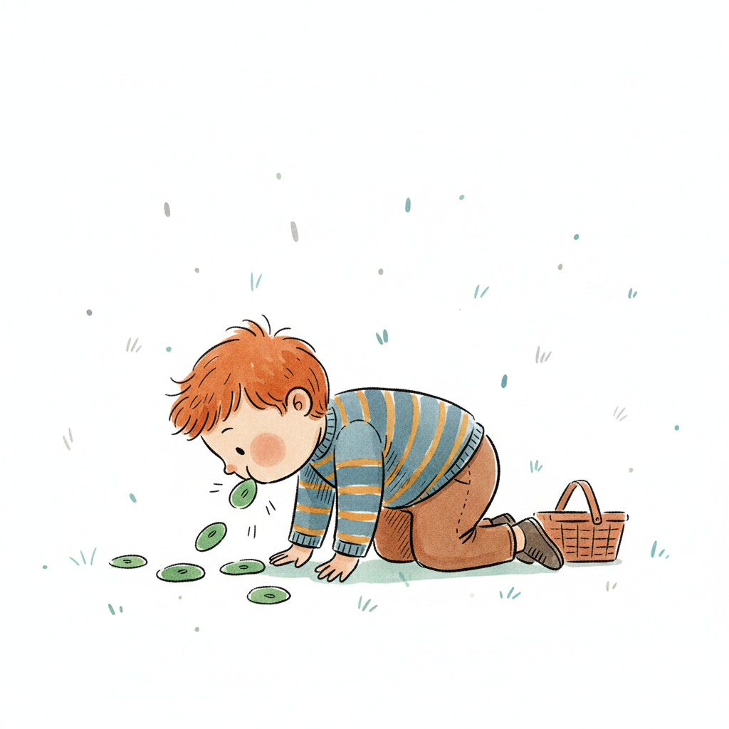 Ein rothaariger Junge auf Knien sammelt grüne Scheiben vom Boden in einen Korb.