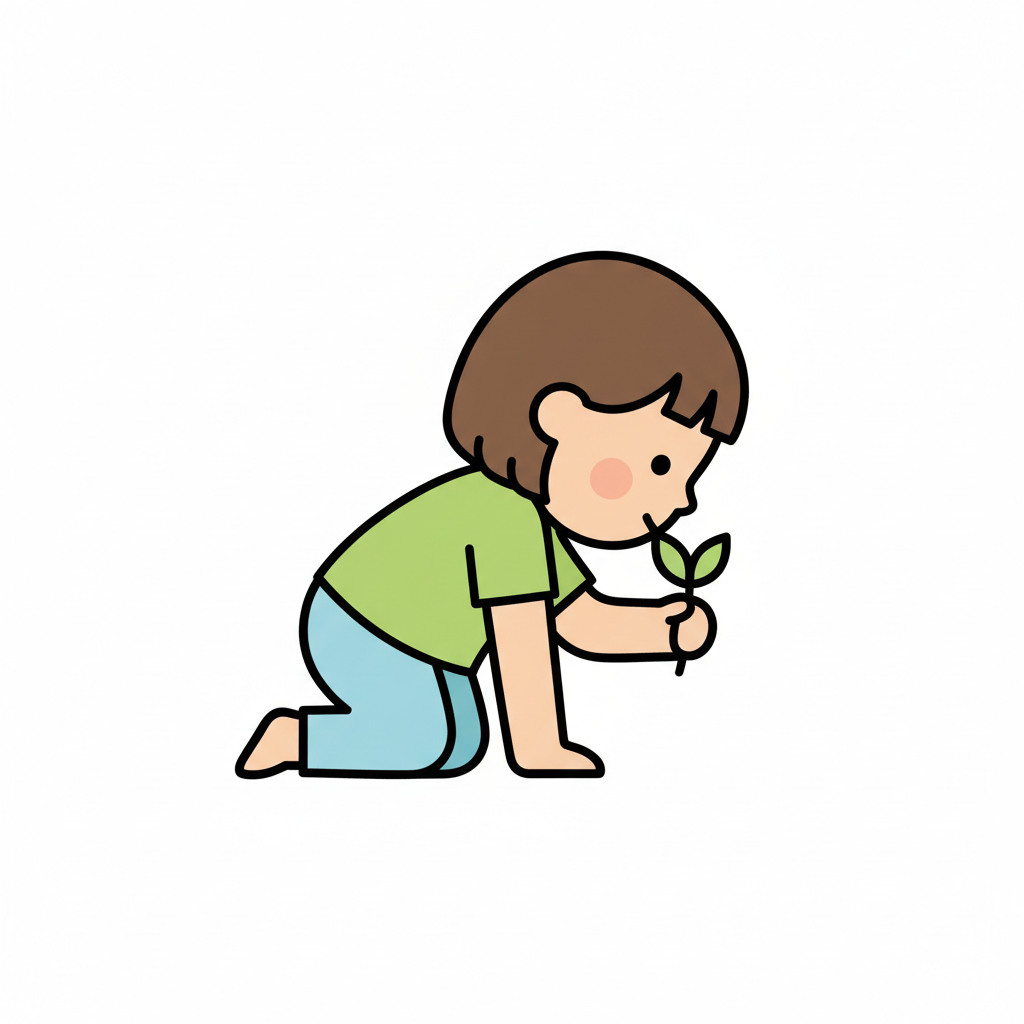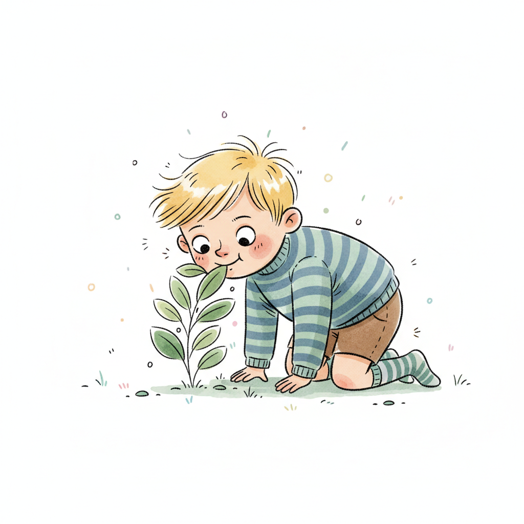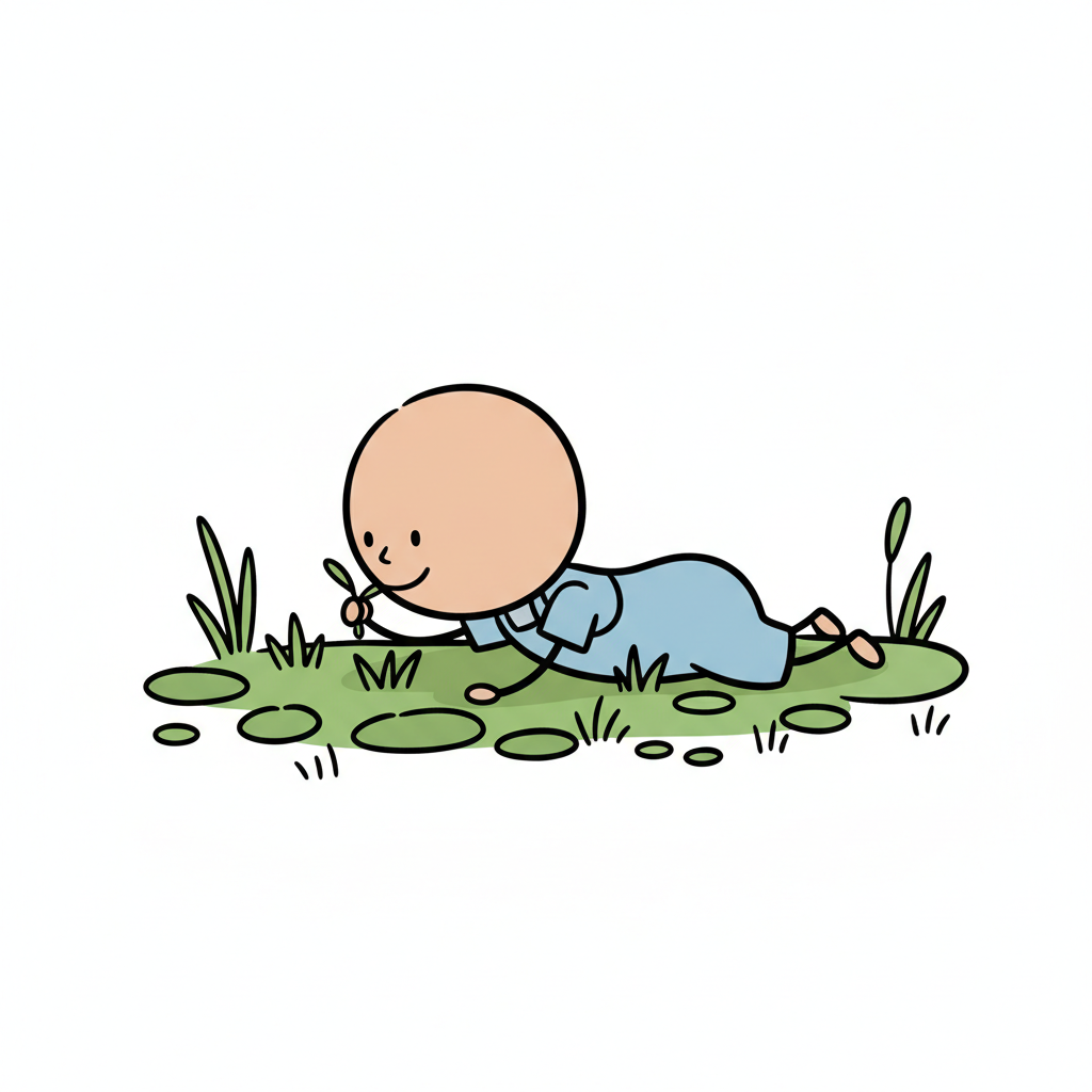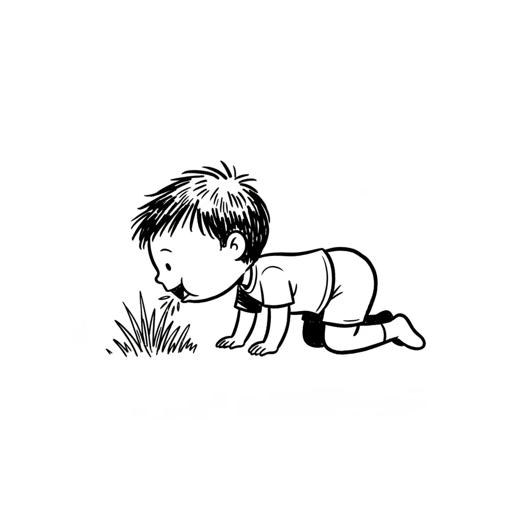 Schwarz-weiße Zeichnung eines krabbelnden Jungen, der neugierig Gras betrachtet.