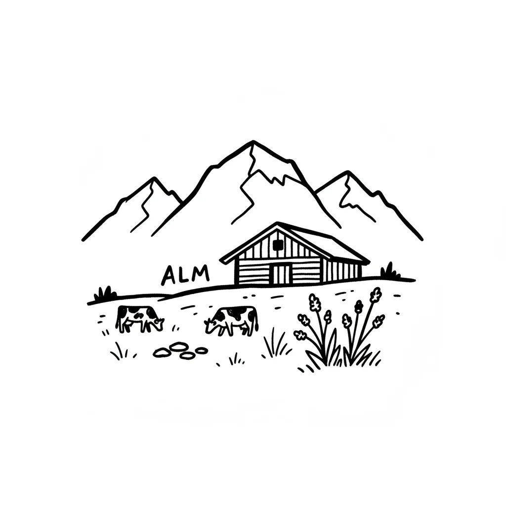 Schwarz-weiße Skizze einer Almhütte mit grasenden Kühen und Bergen im Hintergrund. Schriftzug 'ALM'.