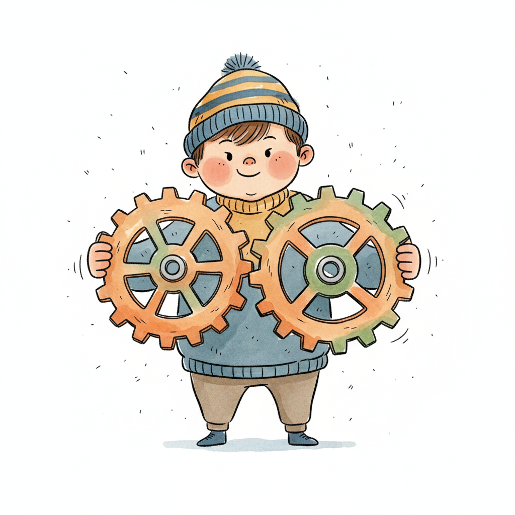 Cartoonfigur in Strickmütze setzt zwei große Zahnräder zusammen, symbolisiert Technik und Lernen.