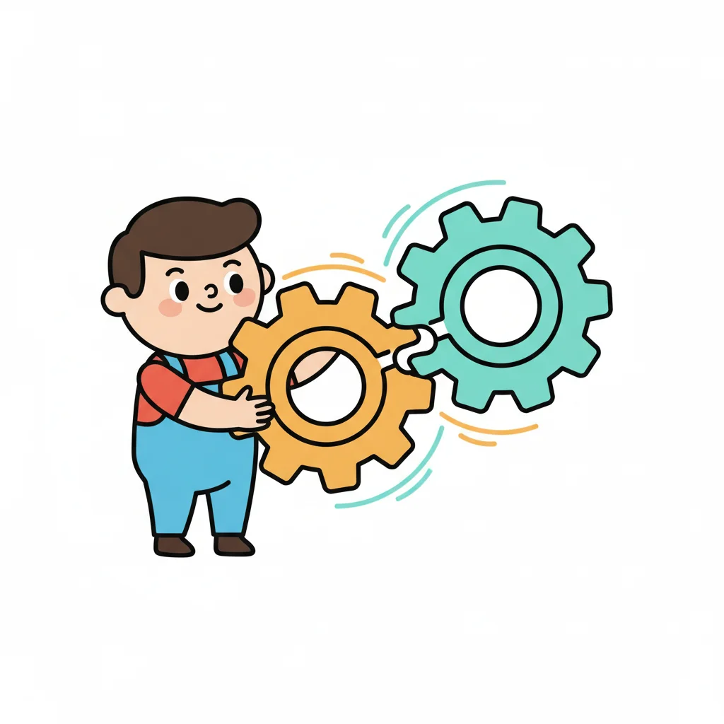 Ein lächelndes Strichmännchen bewegt zwei ineinandergreifende Zahnräder.