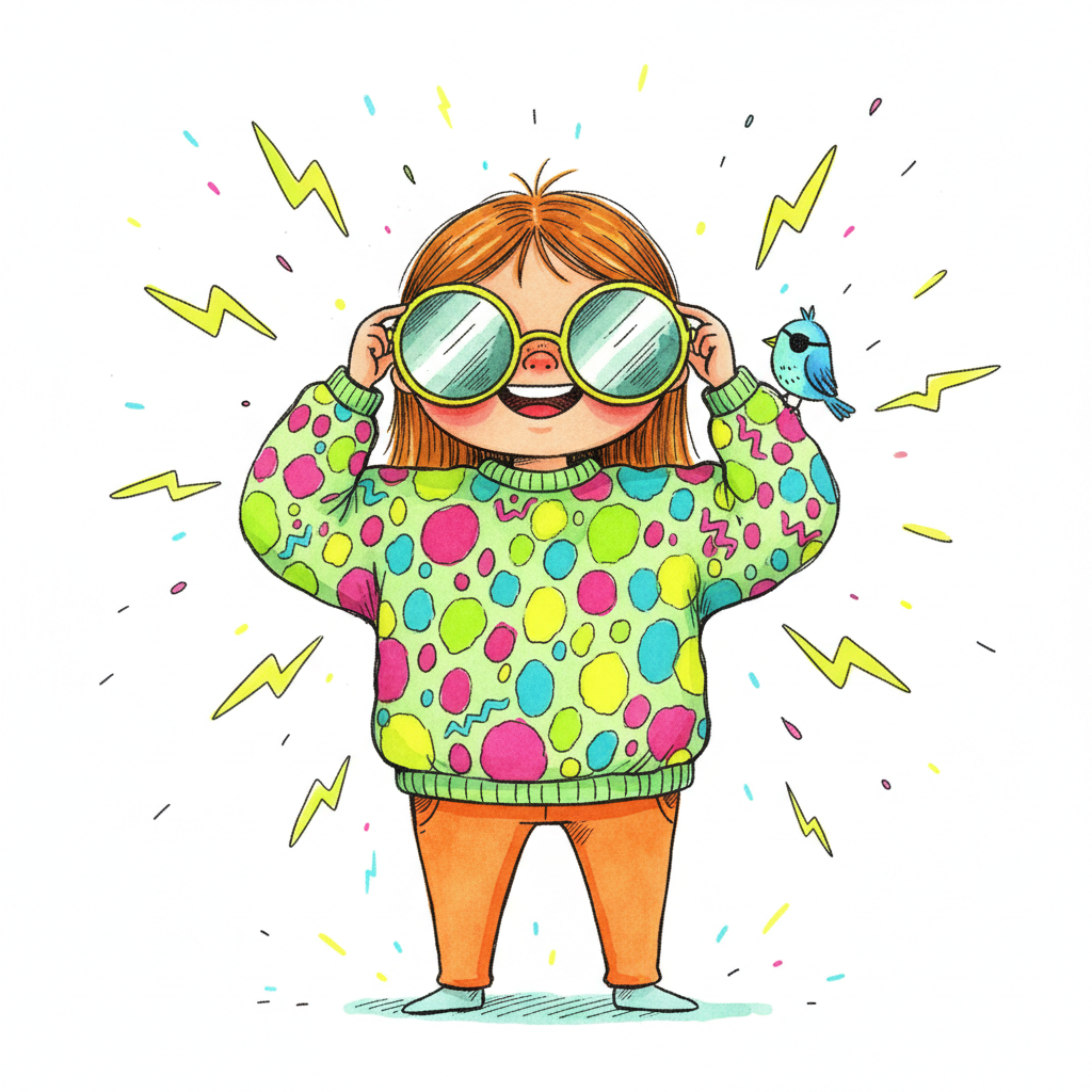 Fröhliches Cartoon-Kind mit großer Brille, buntem Pullover und Vogel auf der Schulter.