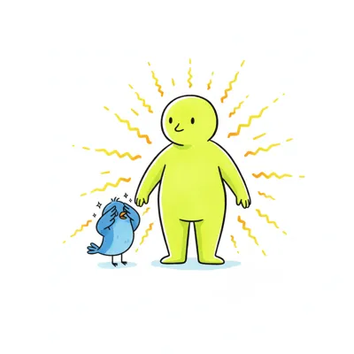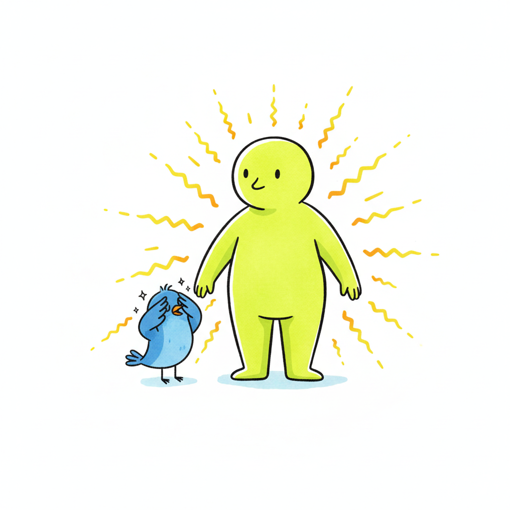 Leuchtende grüne Figur überstrahlt kleinen blauen Vogel, der sich die Augen bedeckt.