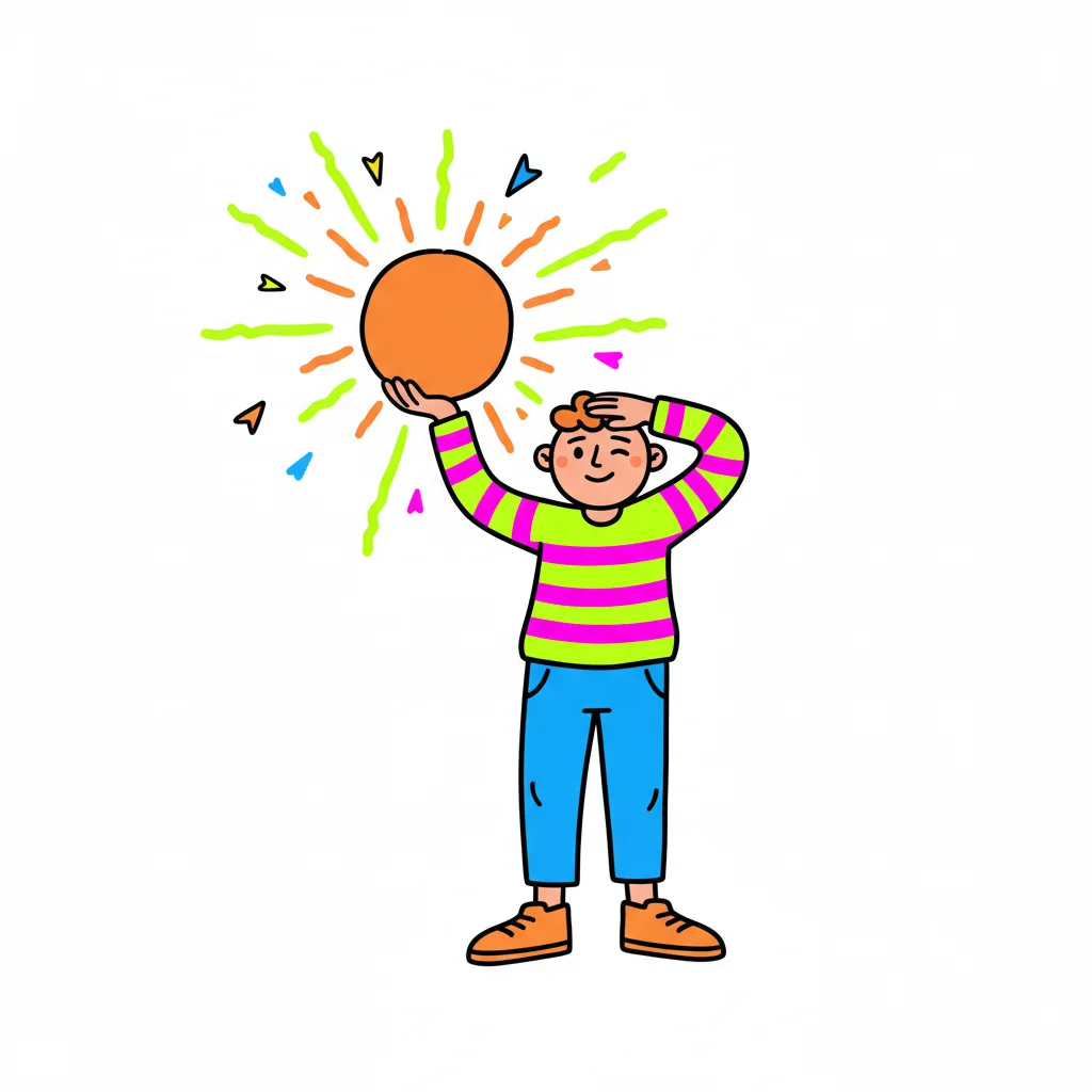 Fröhlicher Cartoon-Junge hält eine leuchtende orange Kugel, die von bunten Strahlen umgeben ist.