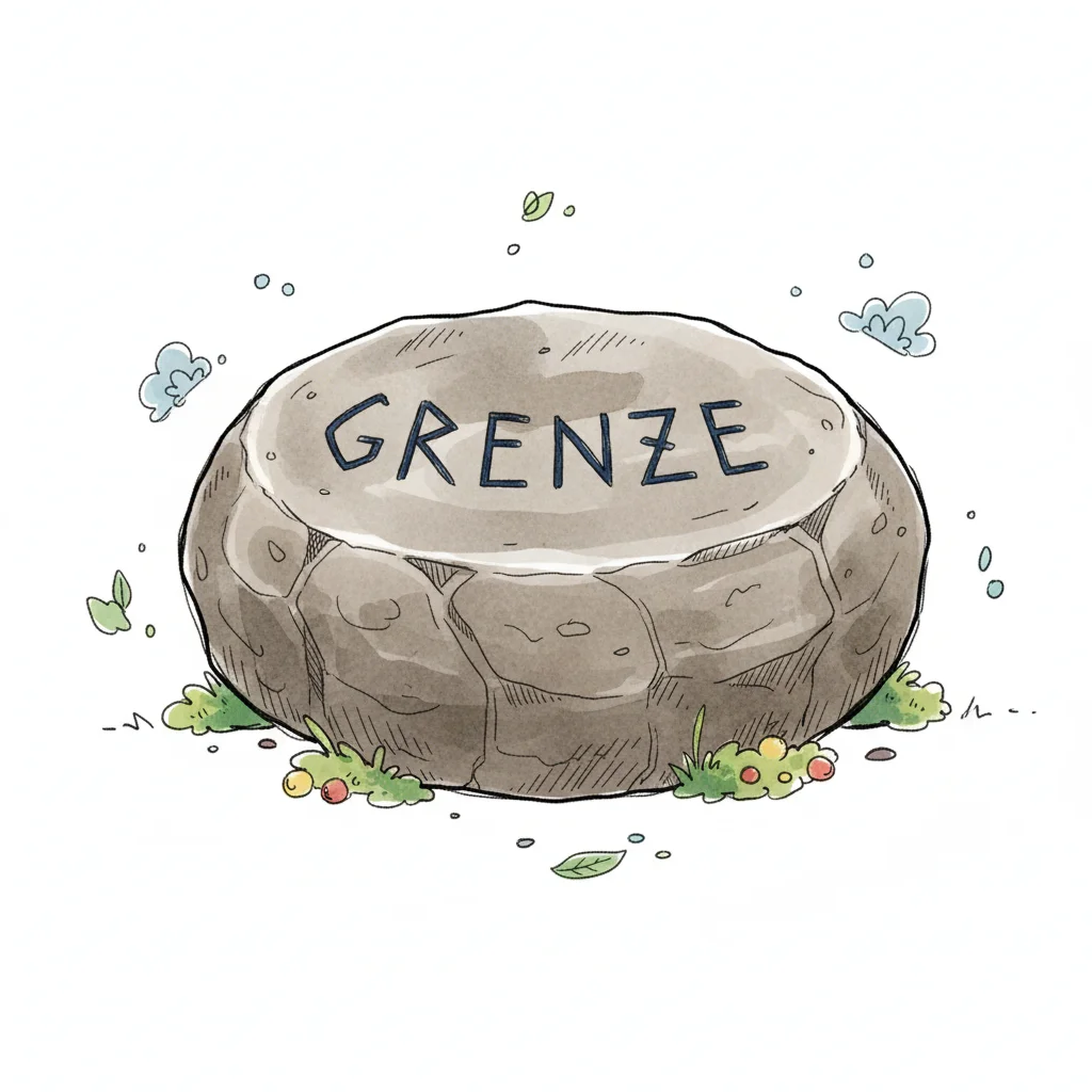 Cartoon-Stein mit der Aufschrift 'GRENZE' auf Gras, umgeben von Blättern und Beeren.