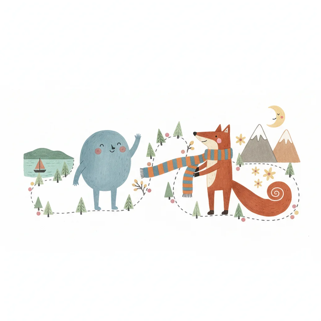 Niedliche Illustration: Blauer Freund und Fuchs auf einer Reise durch Wald und Berge.