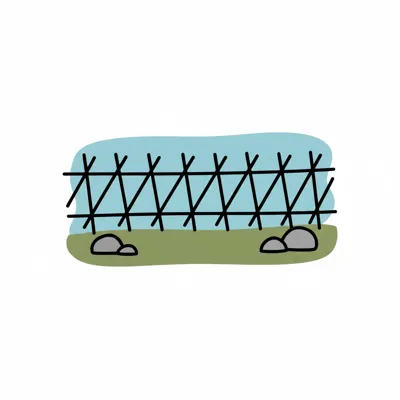 Einfache Illustration eines Zauns aus Stöcken vor blauem Hintergrund mit grünem Boden und Steinen.