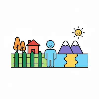 Fröhliche Szene mit Haus, Natur (Bäume, Berge, Fluss) und einem lächelnden Menschen unter der Sonne.