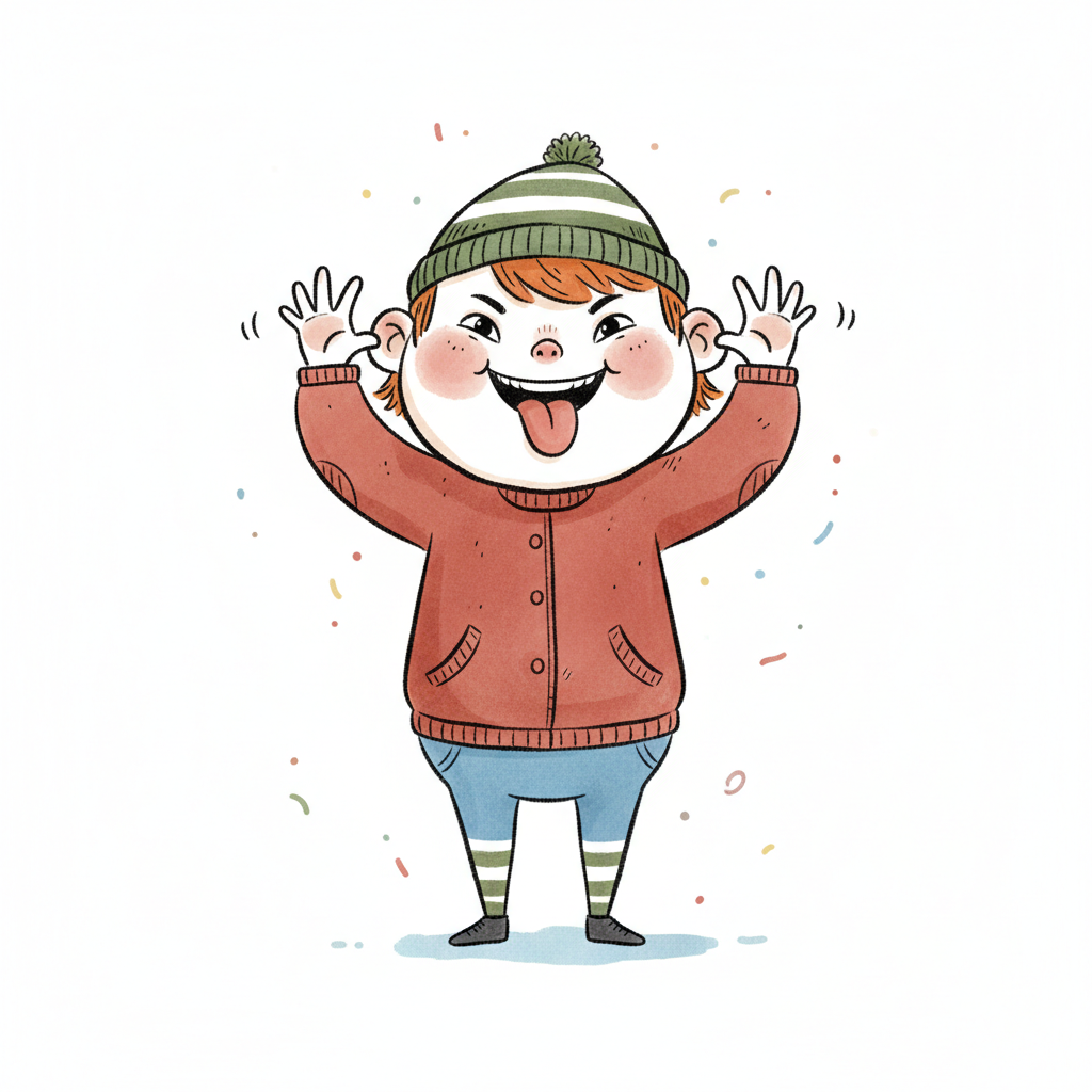 Niedliche, kindgerecht illustrierte Szene mit einem Kind oder einer Person als Hauptfigur, vor rein weißem Hintergrund, im frech-nordischen Aquarell-Skizzenstil. Klare, leicht wackelige Tuschekonturen, sichtbare Pinsel- und Strichtextur, dezente Schraffuren, weiche handgemalte Farbflächen in gedeckten Farben. Einfache, runde Formen. Keine harten Schatten, sondern sanfte, transparente Aquarellschichten. Leicht raue, handgezeichnete Linien statt glatter Vektorkanten. Subtile, vereinzelte Kritzelpunkte oder kleine Details im Hintergrund (wie Pünktchen oder feine Striche), aber keine echte Umgebung oder Landschaft. Die Figur ist mittig zentriert. Insgesamt charmant, humorvoll, warm und handgemacht wirkend. WICHTIG: Das Bild darf ABSOLUT KEINEN TEXT, KEINE BUCHSTABEN und KEINE ZAHLEN enthalten.