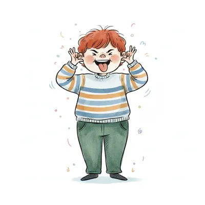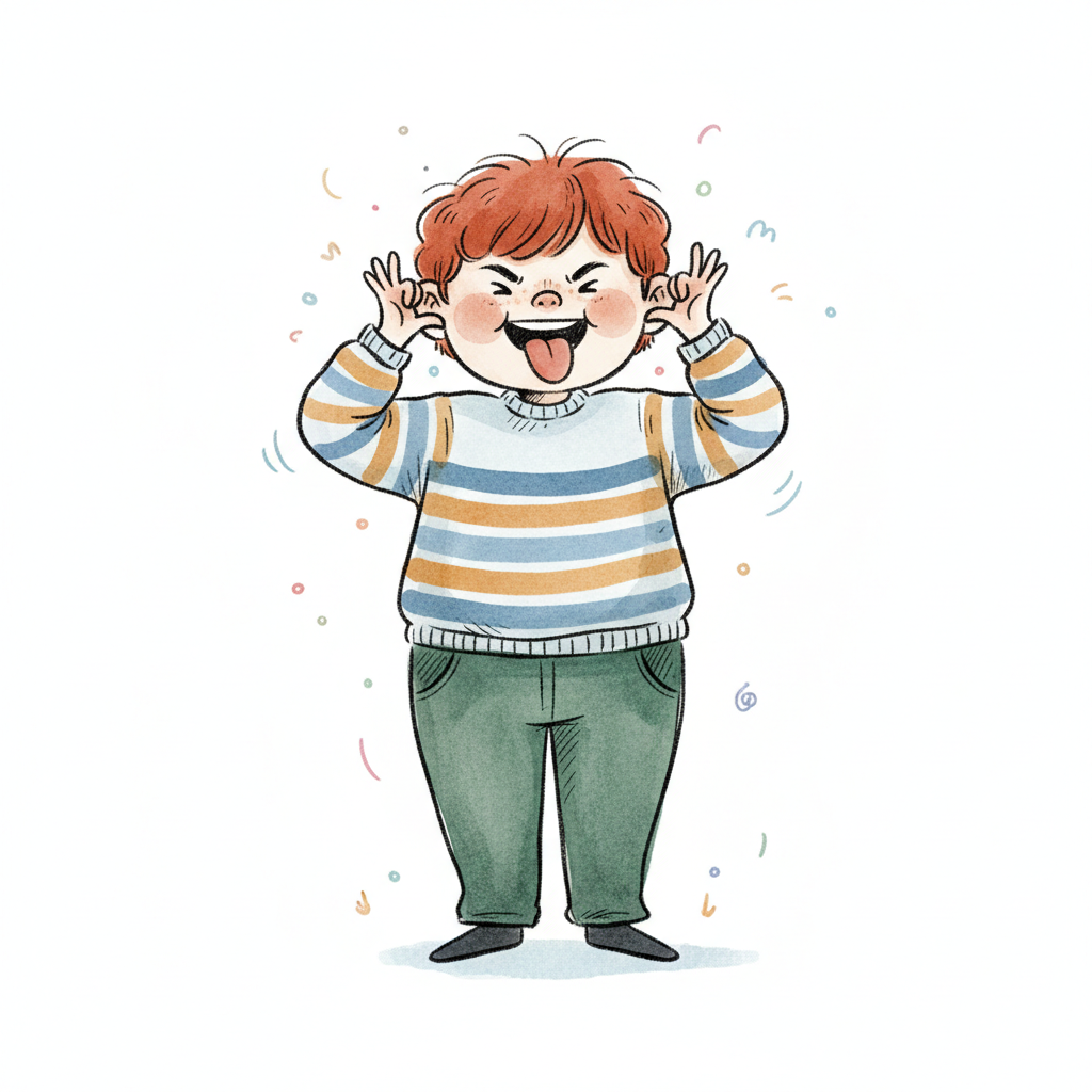 Ein rothaariger Cartoon-Junge zieht Grimassen, streckt die Zunge heraus und zieht an seinen Ohren.