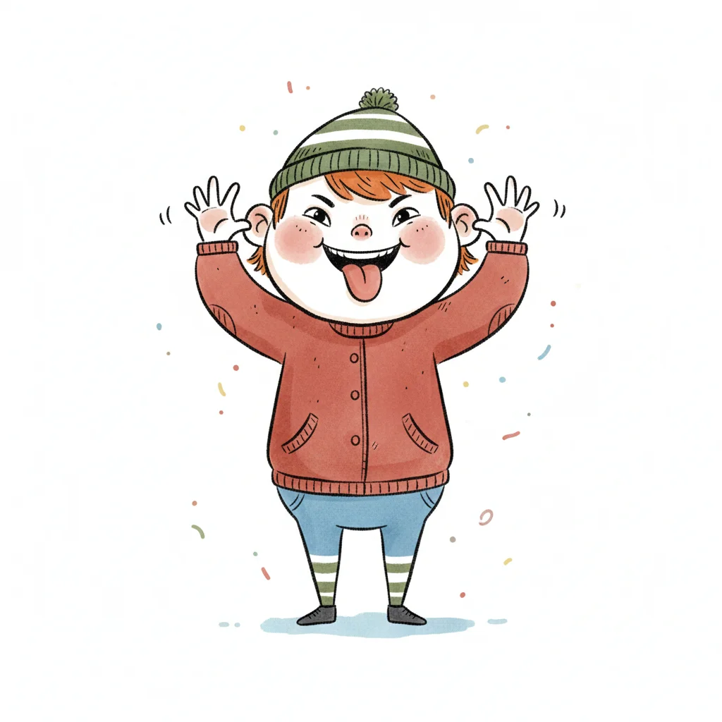 Lustiges Cartoon-Kind mit Mütze zieht Grimasse, streckt Zunge raus und zieht an Ohren.