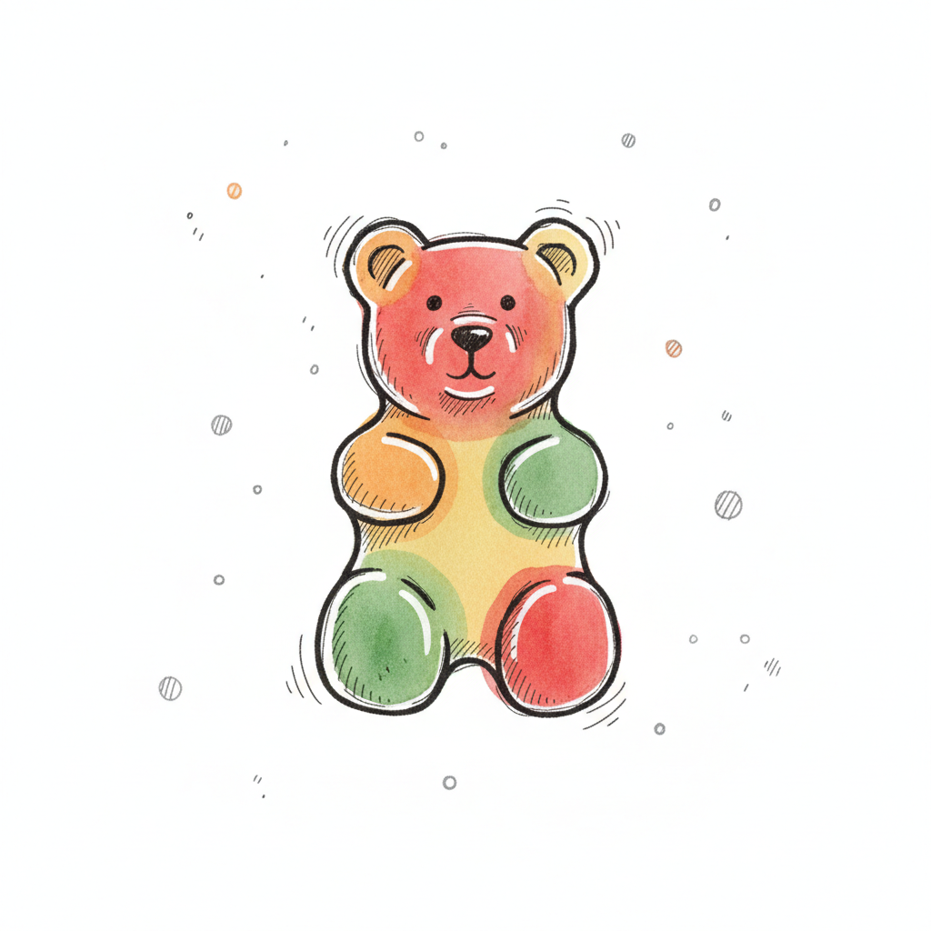 Buntes Gummibärchen in Aquarell-Stil mit schwarzen Umrissen auf weißem Hintergrund.
