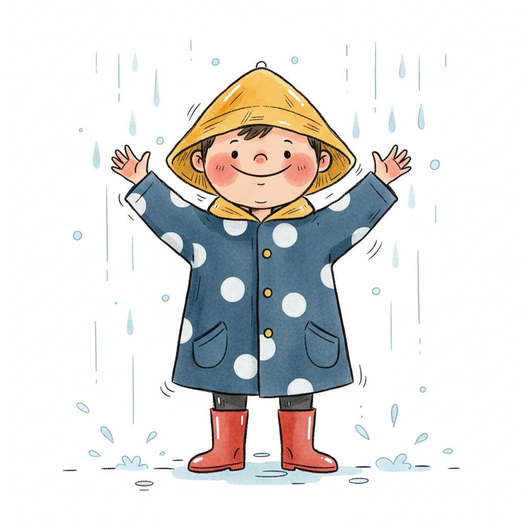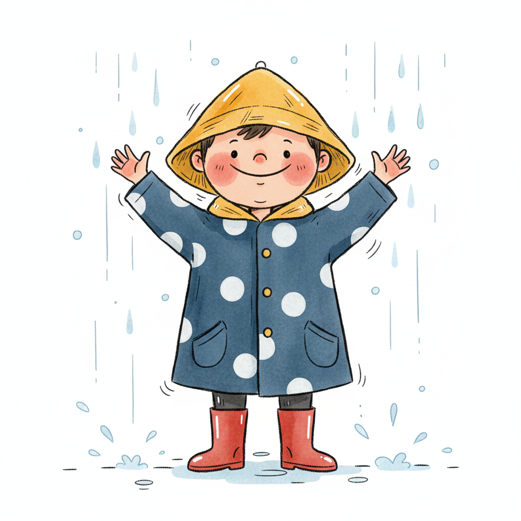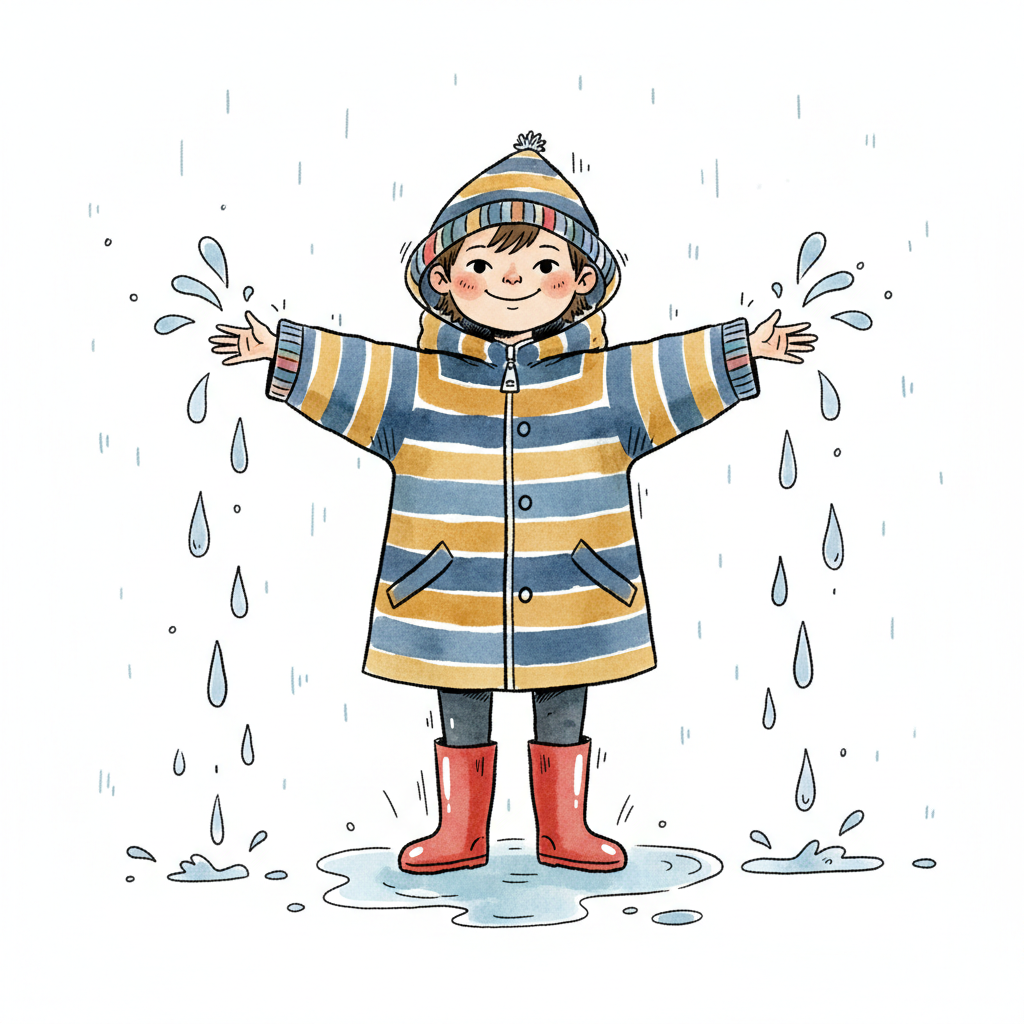 Ein fröhliches Kind in Regenmantel und Gummistiefeln spielt im Regen.