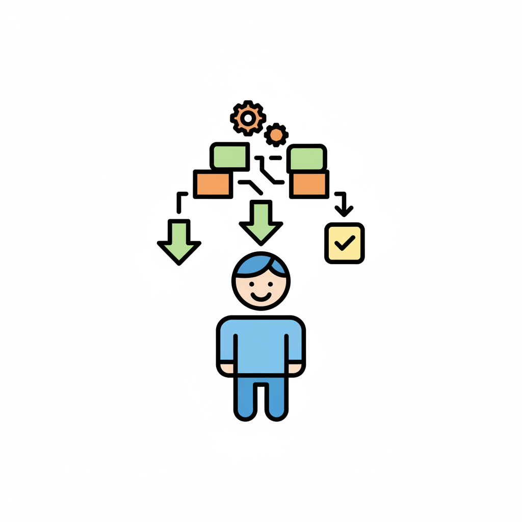 Stilisierte Person mit einem komplexen Prozessfluss über dem Kopf, der zu einem Häkchen führt.