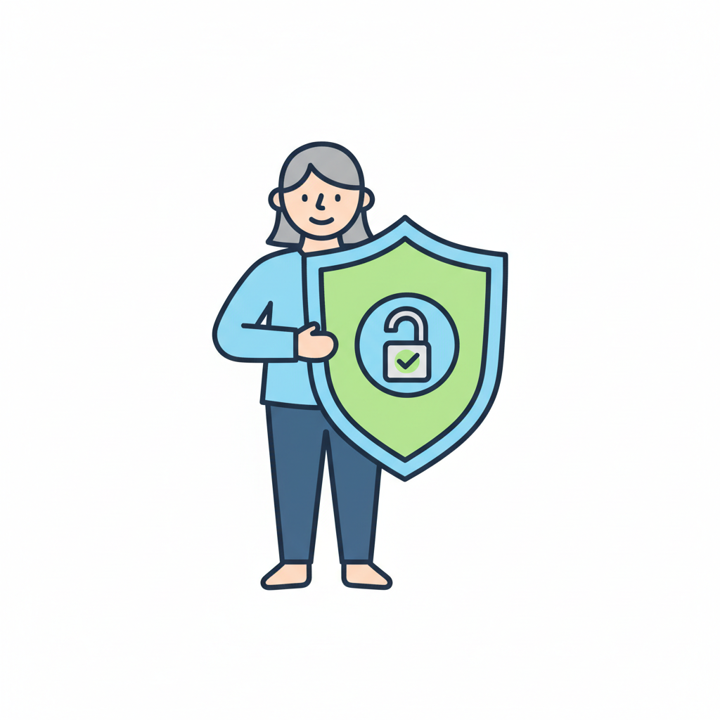 Person hält Schild mit offenem Schloss und Häkchen, symbolisiert Sicherheit und Freigabe.