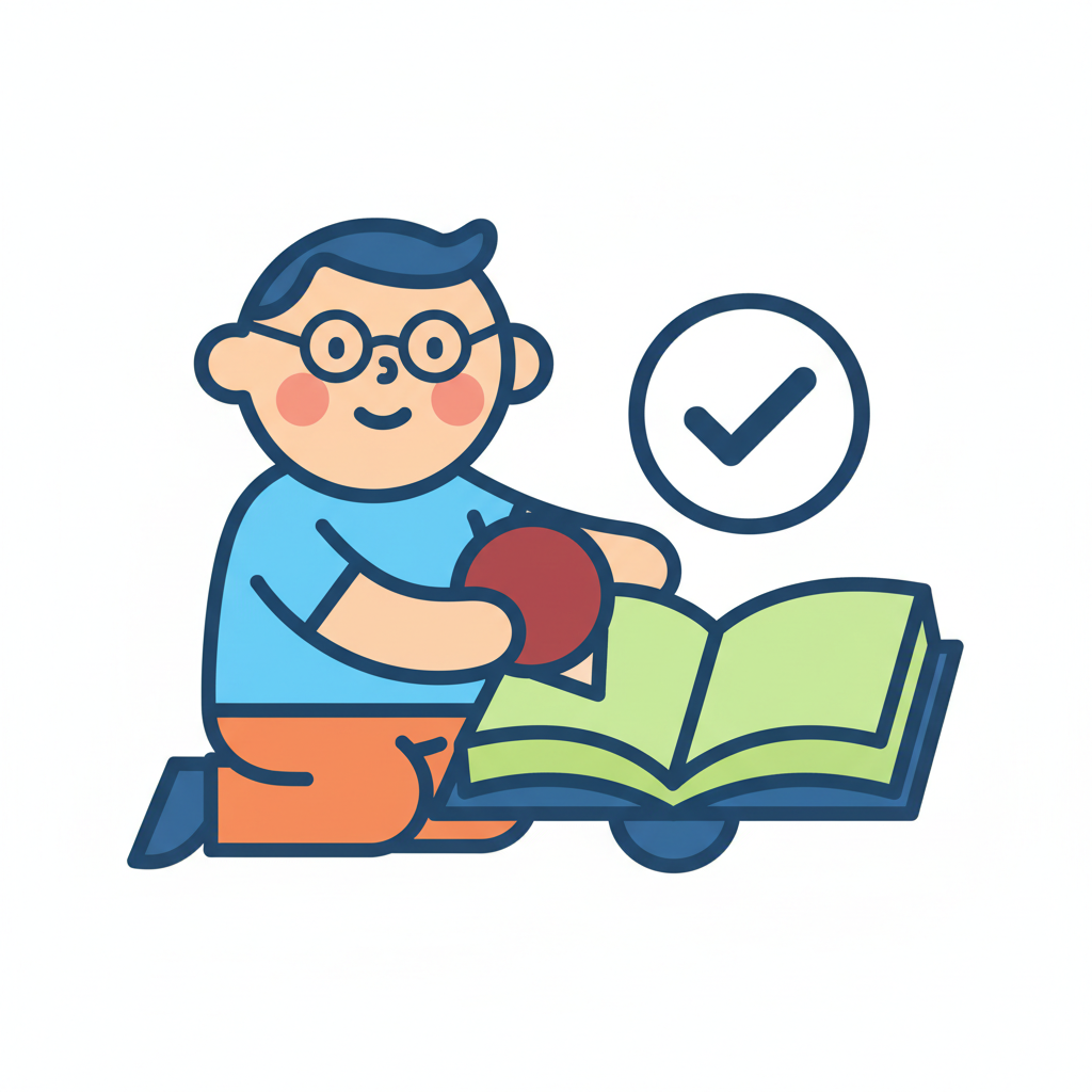 Ein Cartoon-Junge mit Brille hält einen Ball, sitzt neben einem offenen Buch mit Häkchen.